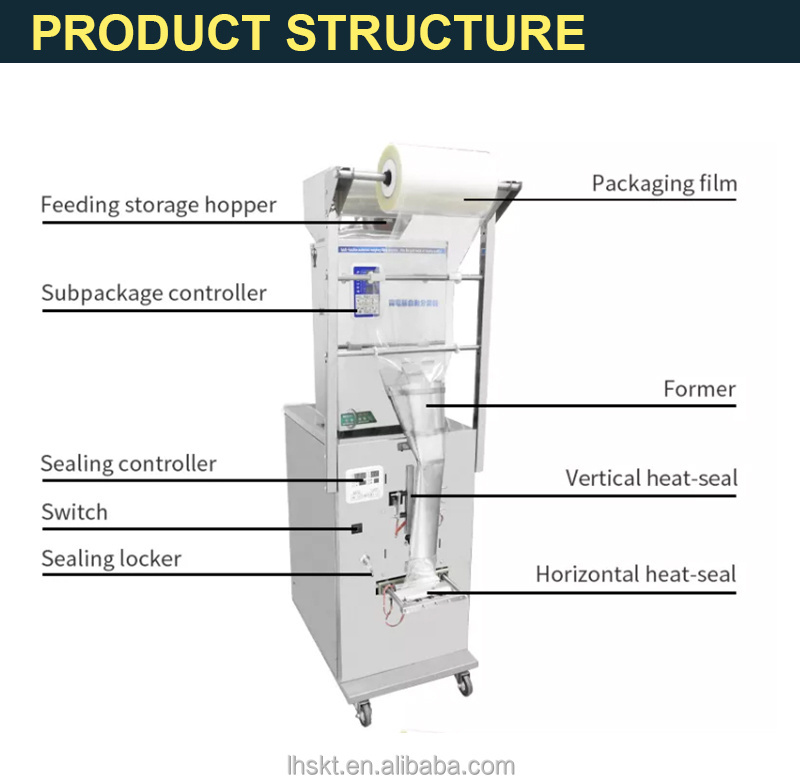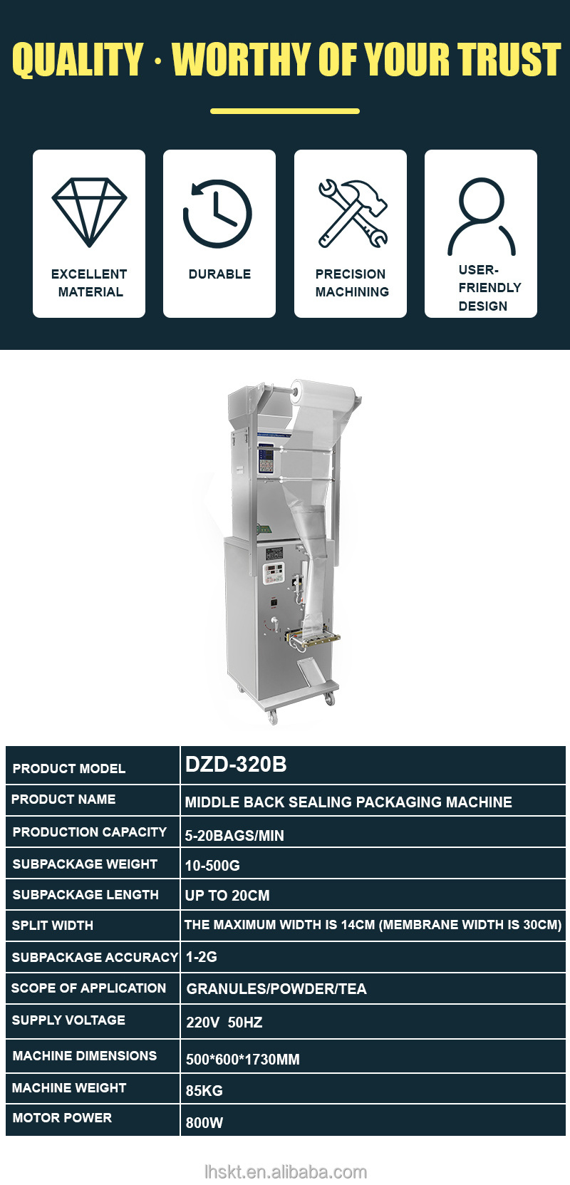 Automatic filling design, quick cutting, innovative and intelligent, high efficiency; can set the length of the bag, more convenient and accurate. Suitable fbr all kinds of powders, drug granules, small electronic accessories, tea & flower