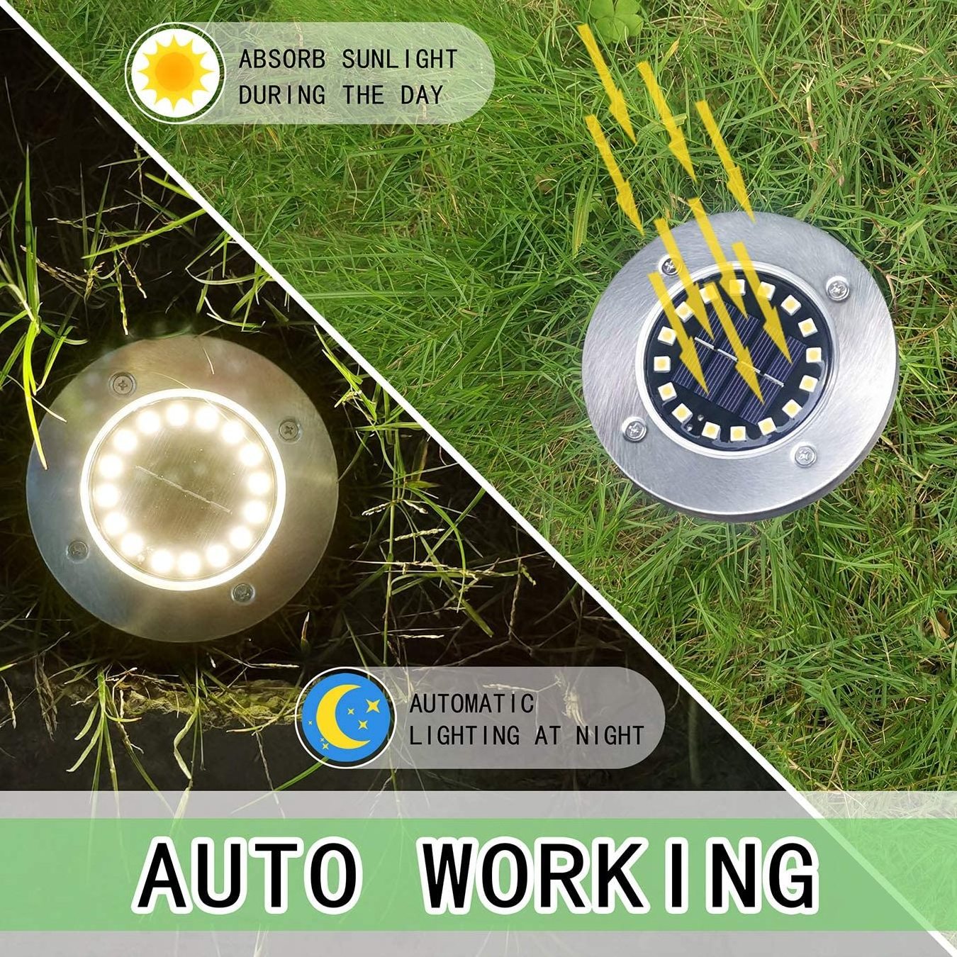 These lights are easy and simple to use on everyday basis and convenient to install on lawn and soft ground. Just need to put them under the sunlight. They will turn on by themselves at dusk, and flick off during the day time.