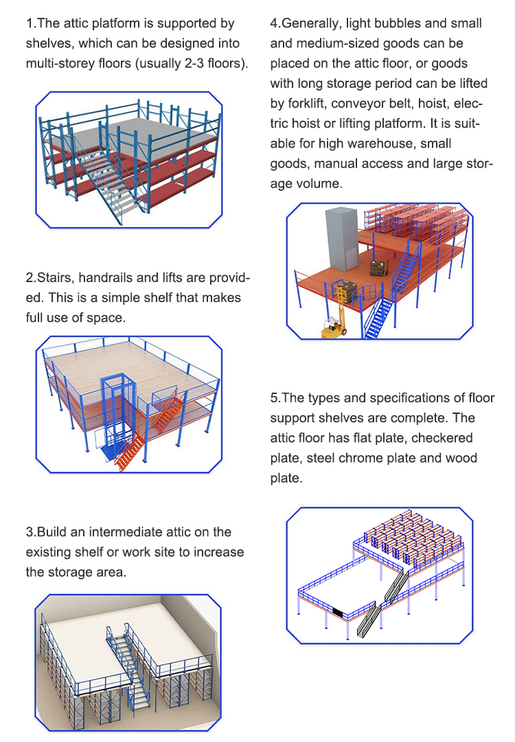 2.Mezzanine Racking System medium-shelf shelves or use heavy shelf shelves plus floor as the main support panel (based on the total weight of the negative shelf unit to determine what kind of shelf), plate appearances usually use wood or cold-rolled steel gusset plate and the like.
