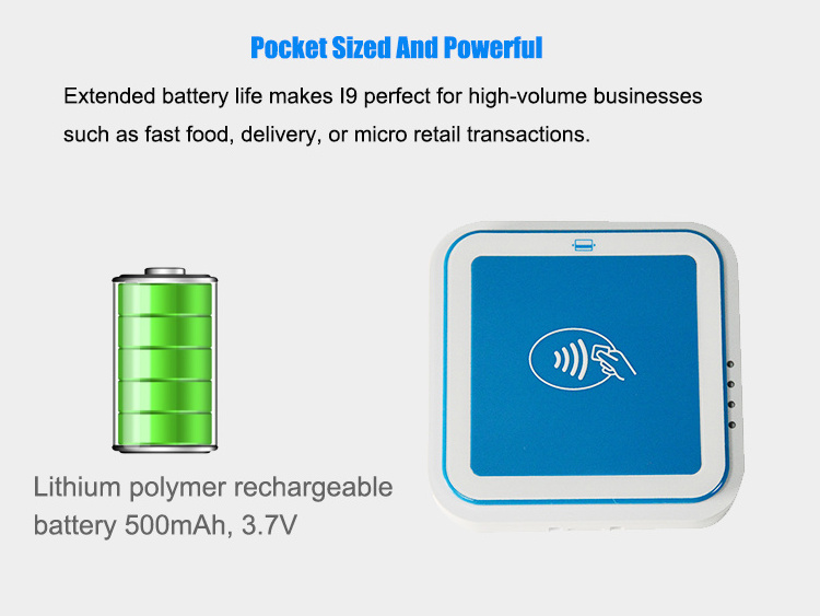 Supporting BT and USB communications, and with buzzer, and specipcally designed for accepting smart card transactions. I9 connects securely via BT to Smartphones and Tablet Computers in order to deliver a seamless mobile solution for merchants and card holders. Extended battery life makes I9 perfect for high-volume businesses like fast food, delivery, or micro retail transactions.