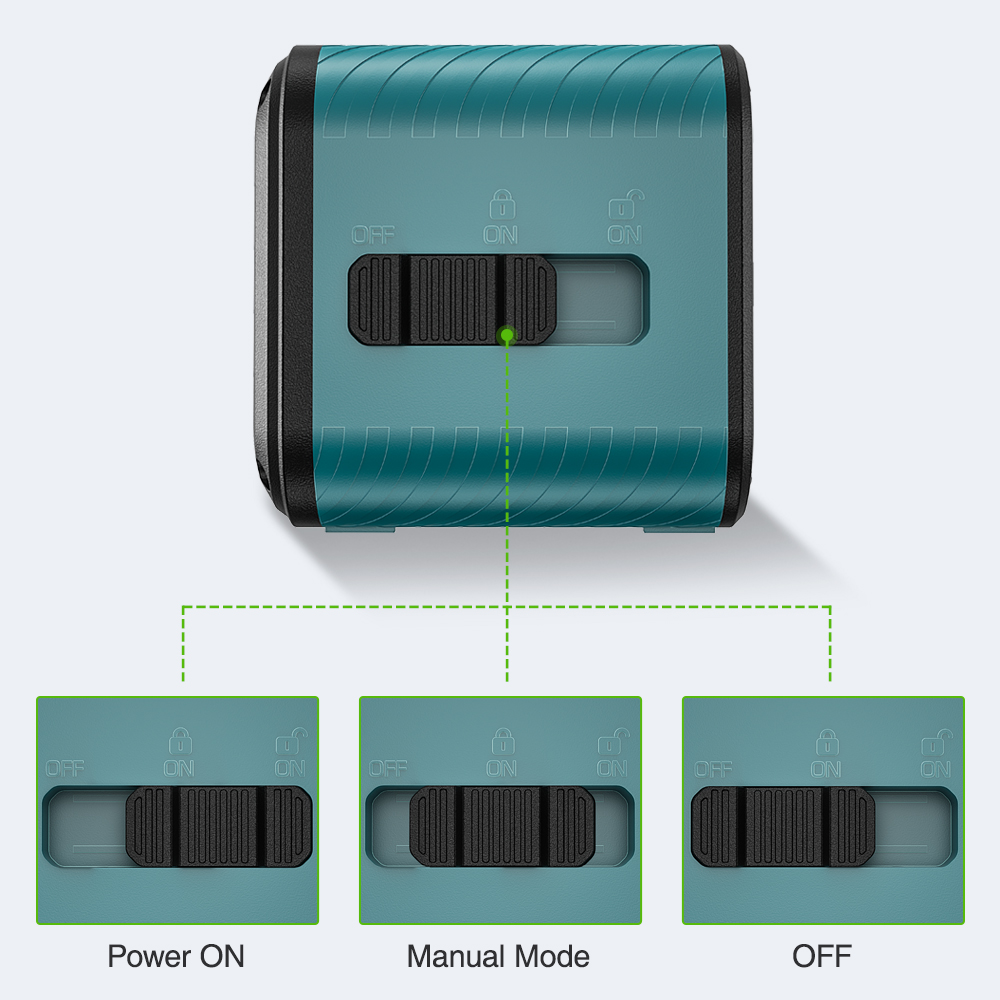 When the laser tool is switched to the unlocked position, the self-leveling mode is enabled. The laser beam will flash when the tool is beyond self-leveling range 4°. Manual mode: When the pendulum lock is in the locked position, you can place the laser tool at any angle to project non-level straightlines.The laser beam will blink every 3-5 seconds to remind you that it's not self-leveling now.
