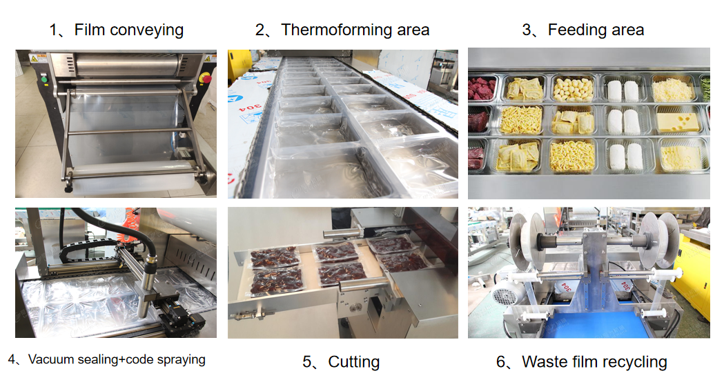 Just put up/down films roll, the machine will form container for food, then seal films together.