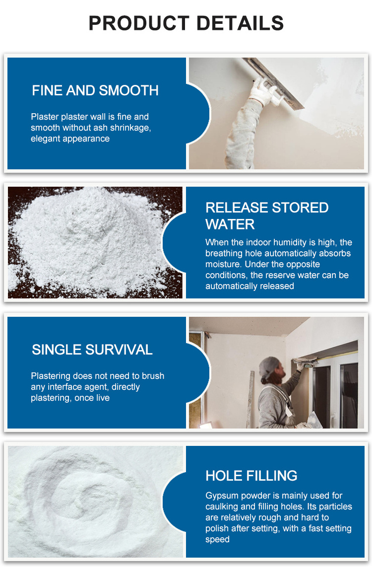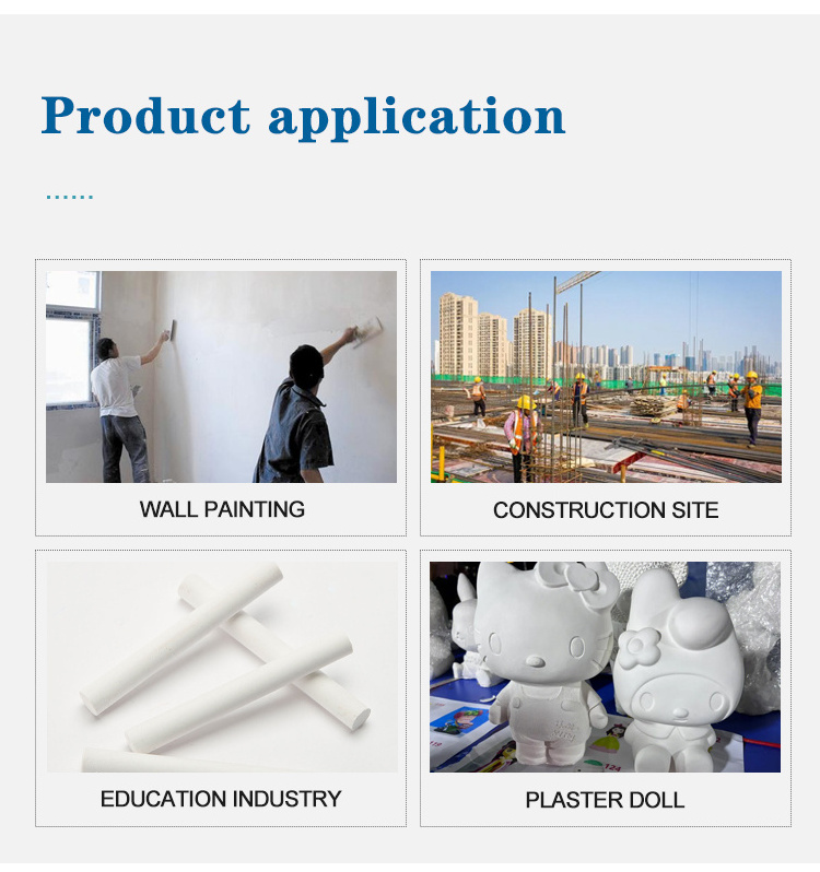 2.Agricultural for improving the Land 3.Cement industry for additives 4.Medical uasge: dental tooth,POP bandage and so on. 5.Artistic sculpture:gypsum cornice,craft 6.Castings interior for silver jewelery,or copper jewelery 7.Construction materials,making gypsum board,drywall joint compound powder |