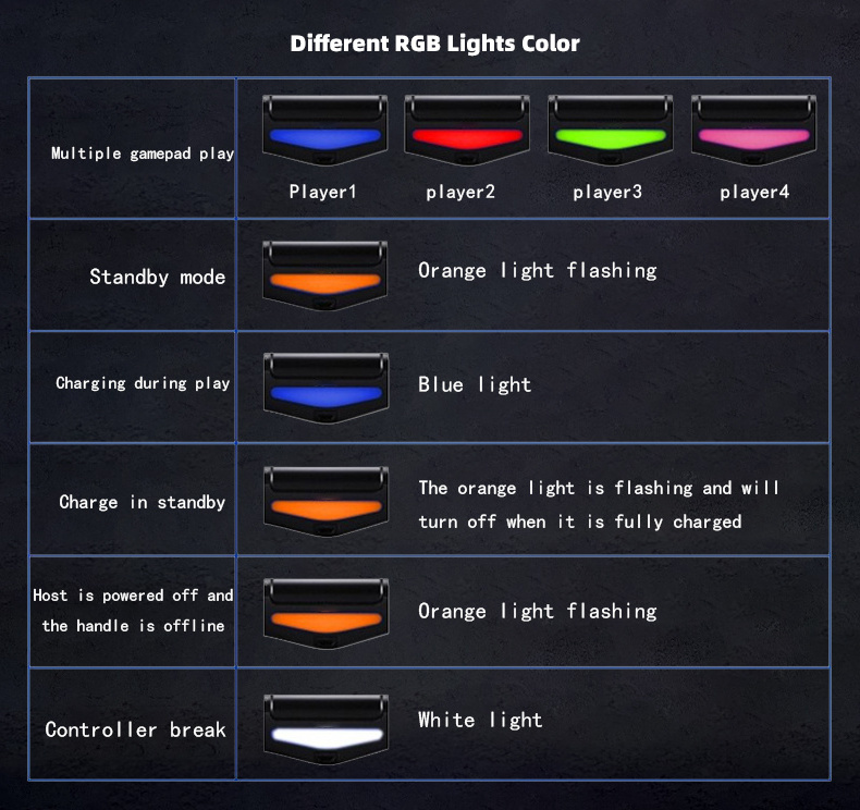 4.Product configuration: BT, Six-axis, Double vibratiorTouch screen, LED light bar, Headphone jack,External speaker, Chargingcable