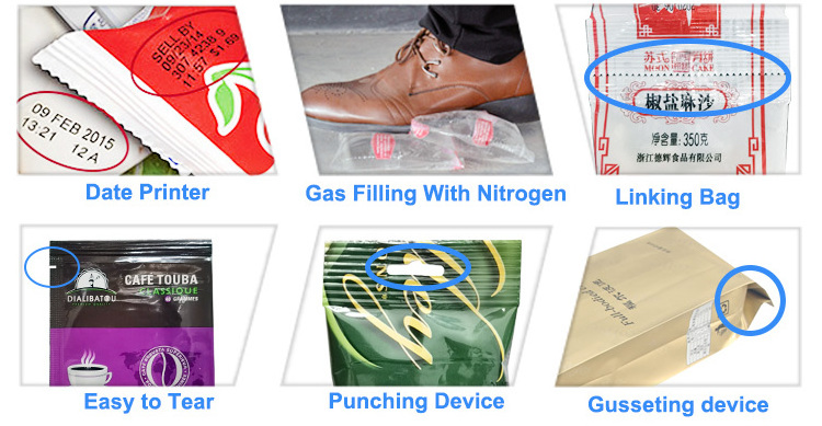 The packaging machine has date coding,fills the package with nitrogen,makes the linking bag,makes the easy tearing and pinches the package.