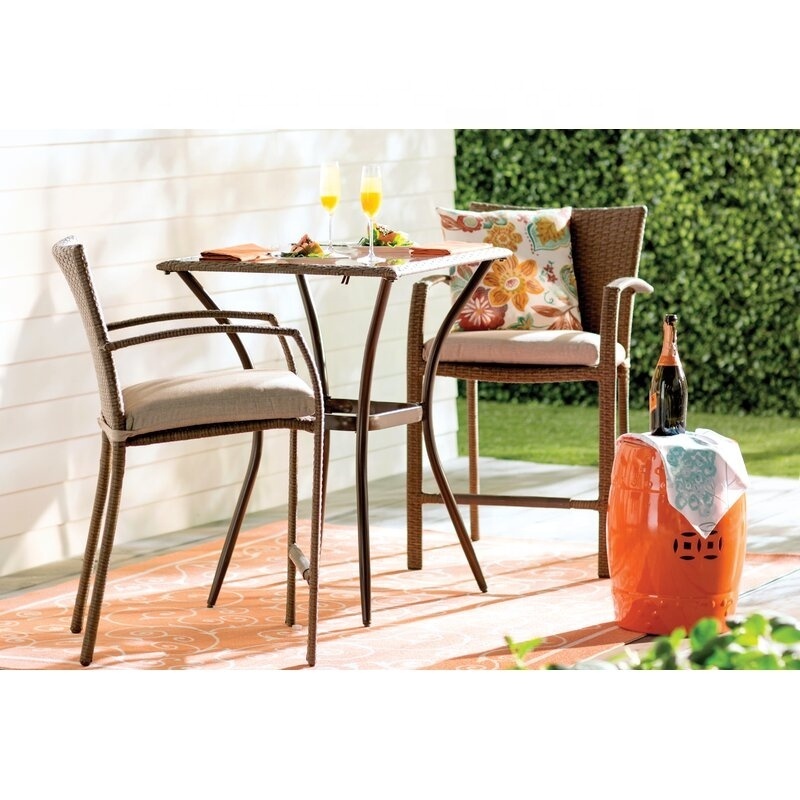 The 3 piece high top bistro Edwards set includes two chairs with a classic woven resin wicker design with plush seat cushions. The