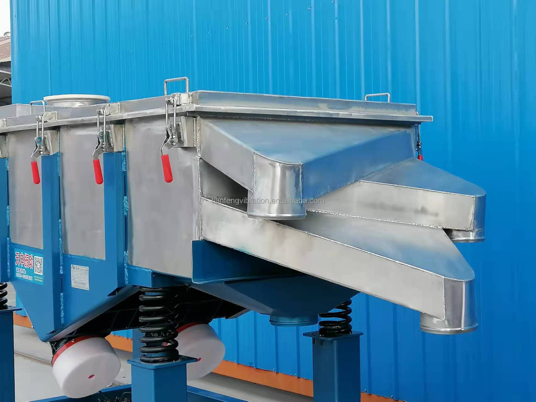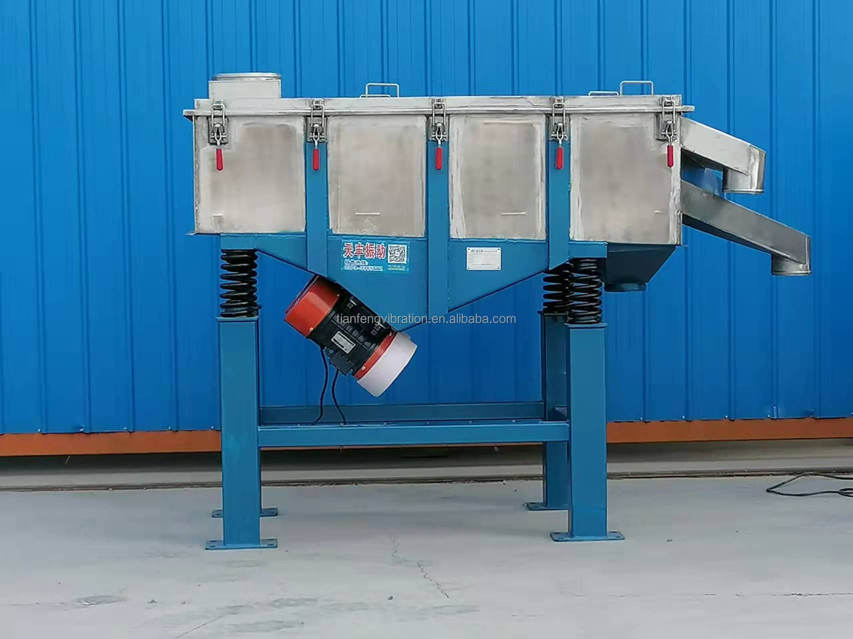 Tianfeng TLZS series linear vibrating screen is composed of vibrating motor, screen box, screen net, vibrating transfer device and vibrating damping device. Tianfeng TLZS series linear vibrating screen can be used for screening powder, particles and other dry materials. At the same time, the equipment can be used for filtering liquid and mucus. The machine can screen raw material to 325 mesh. The machine adopts adjusted excitation power. According to the screening requirement and the filtering requirement of the customers, the linear vibrating screen produced by Tianfeng can be used with single layer and multi-layer, and the screen layer can be designed into 5 layers. Generally speaking, the screen frame of the linear vibrating screen is wooden structure. About the raw material of the contact part, you can choose stainless steel if you need to screen corrosive material. The application industry of the machine is very extensive such as plastic processing, abrasive processing, chemical industry, medicine processing, building material, grain processing, carbon processing, fertilizer processing and other industries.