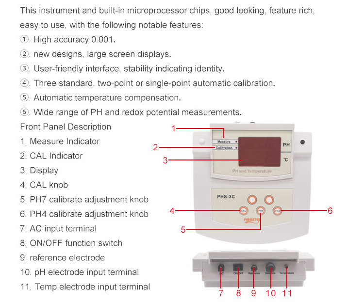 5. Automatic temperature compensation.6.Wide range of PH and redox potential measurements.
