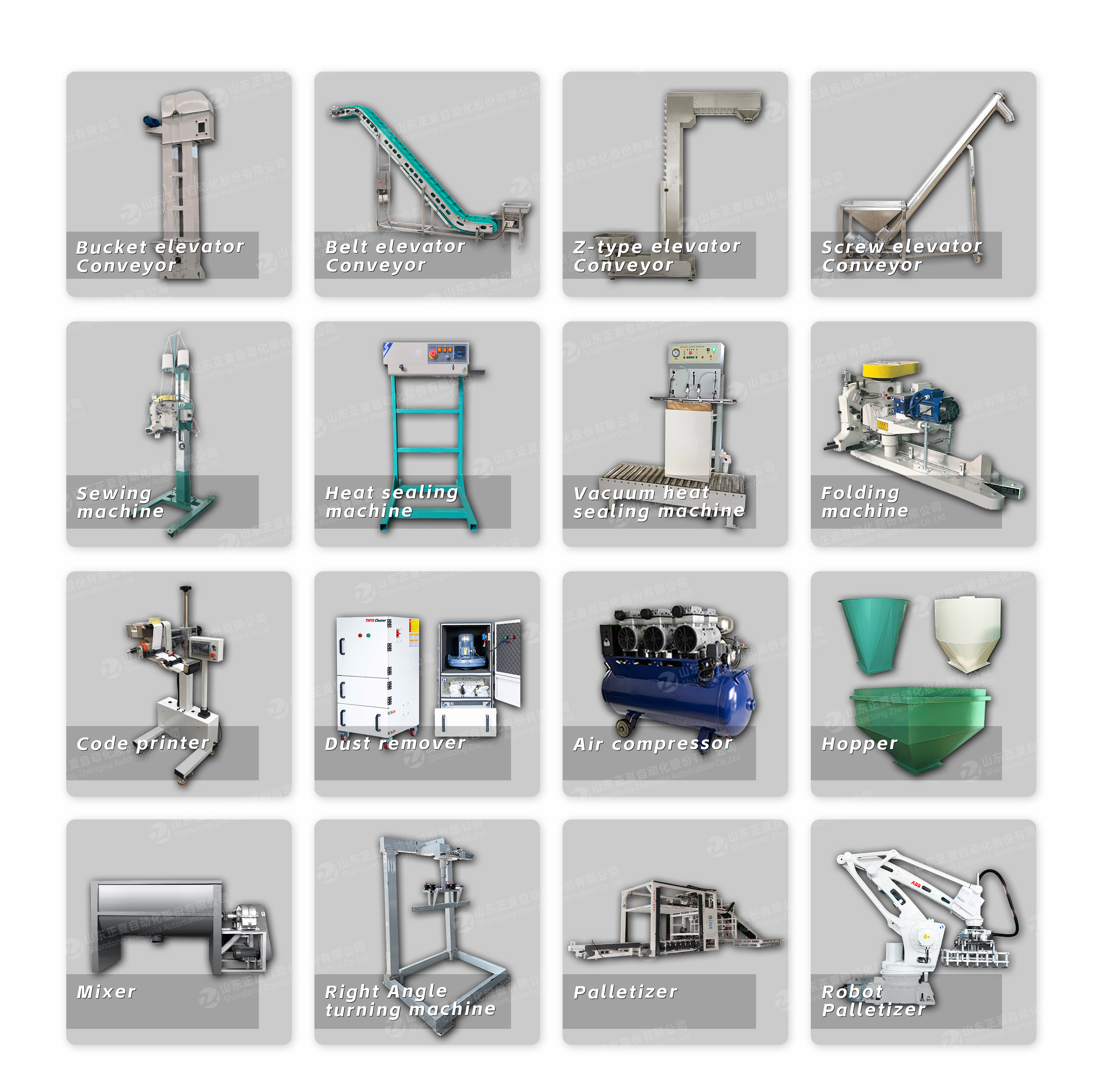 Giving the bag (loading the bag) → automatically clamps the bag→ material is automatically quantitatively weighed and filled into bags→ automatic bag release /bag holding/bag transfer→ automatic label feeding /folding /or heat sealing/or sewing→ entering the next process such as stacking on pallet and wrapping.