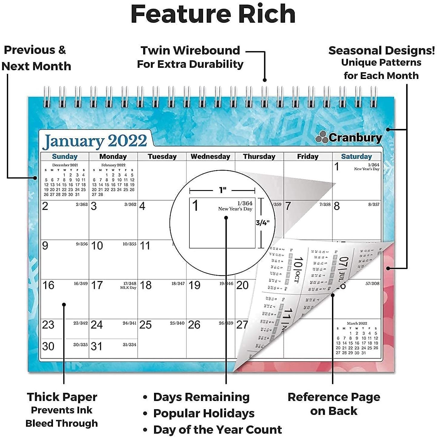 * Feature Rich: Standing flip calendar has Holidays, Daylight Savings, Julian day-of-the-year counters, mini previous and next month reference, full year reference and Notes area on back page.