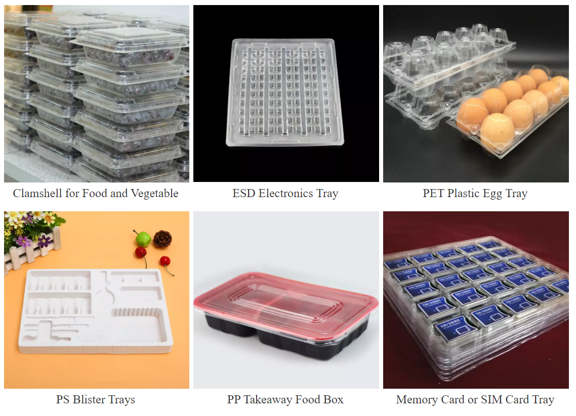Suitable for the molding of HIPS, PS, PP, PVC, PET, etc. plastic sheets, processing high transparency, high stretch, shallow stretch, round, square, irregular, up and down bidirectional stretching , Flanging and other products, producing various boxes, dishes, trays, bowls, covers, industrial packaging, food packaging, cosmetics packaging and other packaging and other plastic products.