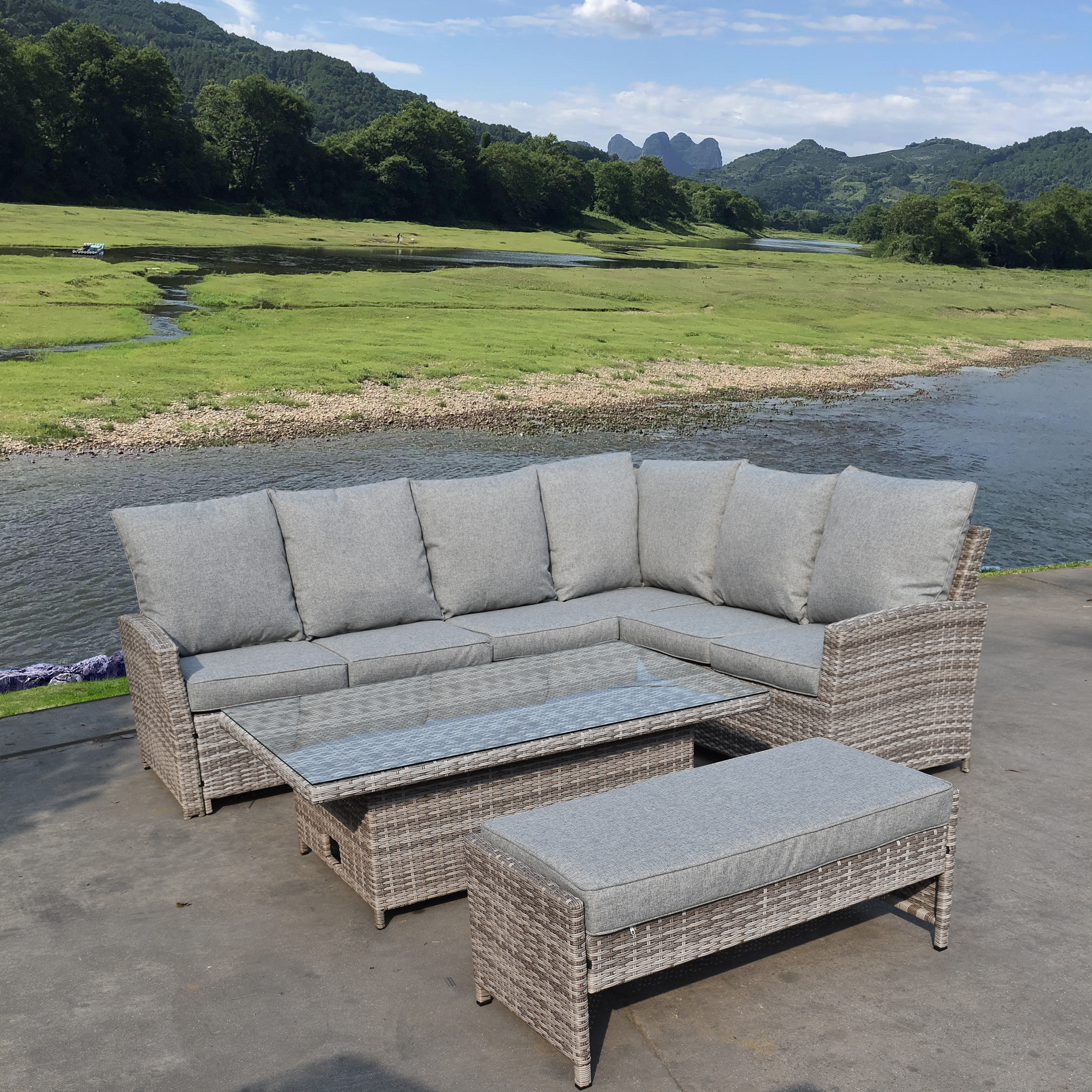 * 【5 PIECES PATIO FURNITURE SET】5-piece garden furniture set come with 1*Coffee table, 1*Three-Seater Sofa, 1* Two-Seater Sofa, 1*Corner Sofa, 1*Ottoman. Most importantly, it can be combined in a variety of ways to meet your different needs.