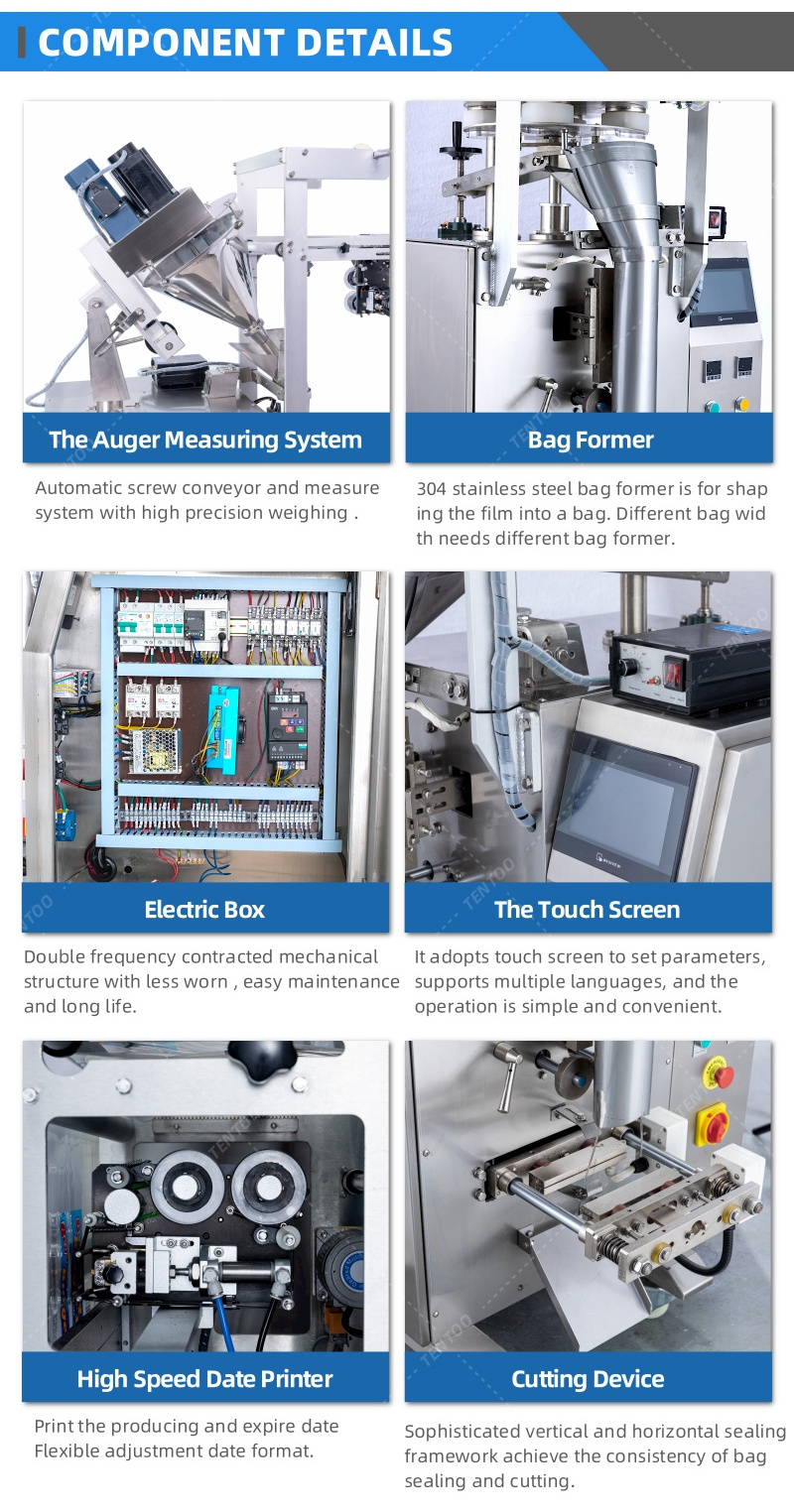 4. It completes the whole procedure of filling, measuring, bagging, date printing, charging(exhausting), product out-putting