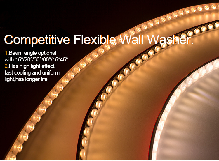We applied TPU material for the flexible wall washer- anti-yellow, high temperature durable, corrosion resistance; weak acid and alkali resistance; good flexibility. PU glue potting, strong adhesion, good durability and high reliability. It can replace the traditional aluminum heavy wall washer or LED light bar due to its small size, light weight, flexible and easy to install. A variety of beam angles are available, suitable for different environments/locations. Low voltage (DC24V) for human safety, various colors available, including CCT, RGB, RGBW and digital running in the controlling of programmable DMX512.