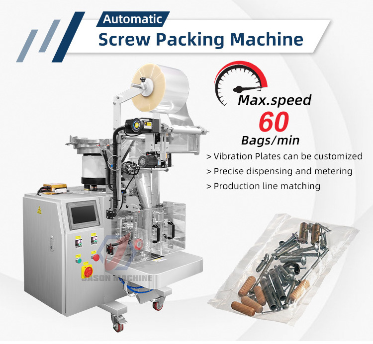 Automatic hardware fittings packing machine applicable all kinds of solid products that require mixed packaging, such as nails, screws, nuts, washers, toys, blocks, dice, small dolls, etc.