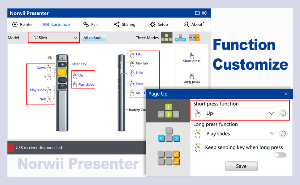 Function customization allows the user to set a hotkey for each individual key of the presenter.