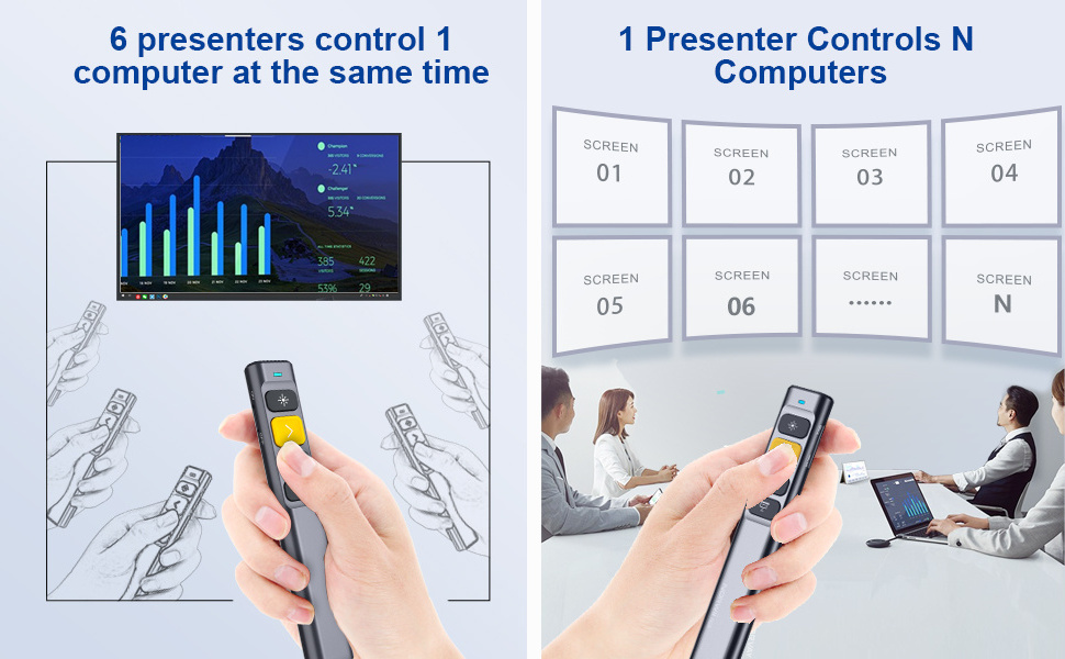 If you have more wireless presenters, repeat pairing operation, you can save up to 6 wireless presenters’ unique code into 1 USB receiver. This means 1 USB receiver can be controlled by up to 6 wireless presenters at the same time. If you save 1 wireless presenter’ unique code into N USB receivers, it means 1 presenter can controls N computers.