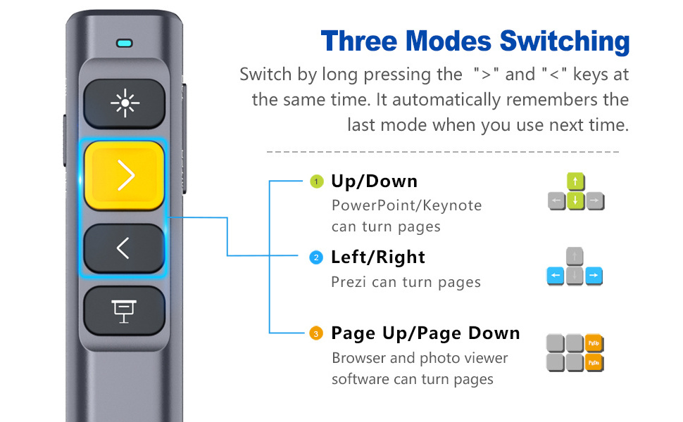 keys are Up and Down. They work for PowerPoint and Keynote. After the first switch, their functions are Right and Left. They work well for Prezi. After the second switch, their functions are the Page up and Page down. They work for web browsers, PDF readers and graphic viewers. After the third switch, their functions turn back to the Right and Left. The presenter will remember your setting for your next use.
