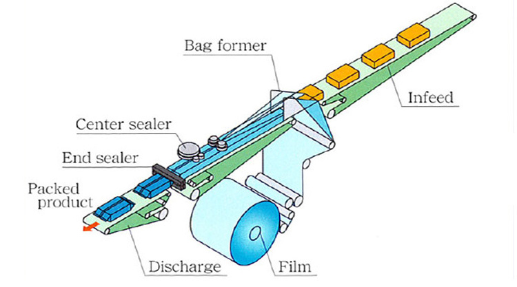 The machine working starts with a cylindrical roll of film. The flow wrapping machine will transfer the film from the roll and through to the forming collar (sometimes referred to as tube or plow). At the same time, a conveyor has lined up individual products for wrapping. The film is fed through the collar and the product is surrounded with film, sealed and the film is then cut. The finished individual product is then gathered downstream to be bagged or cartoned prior to boxing and palletizing.