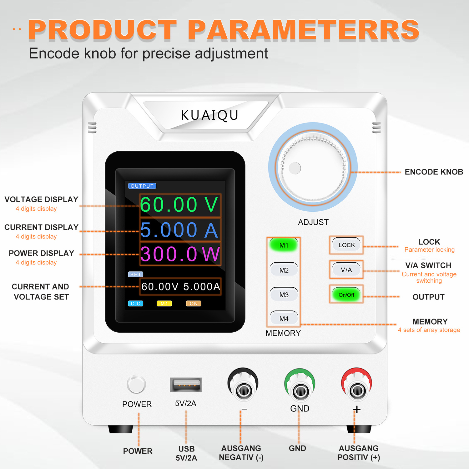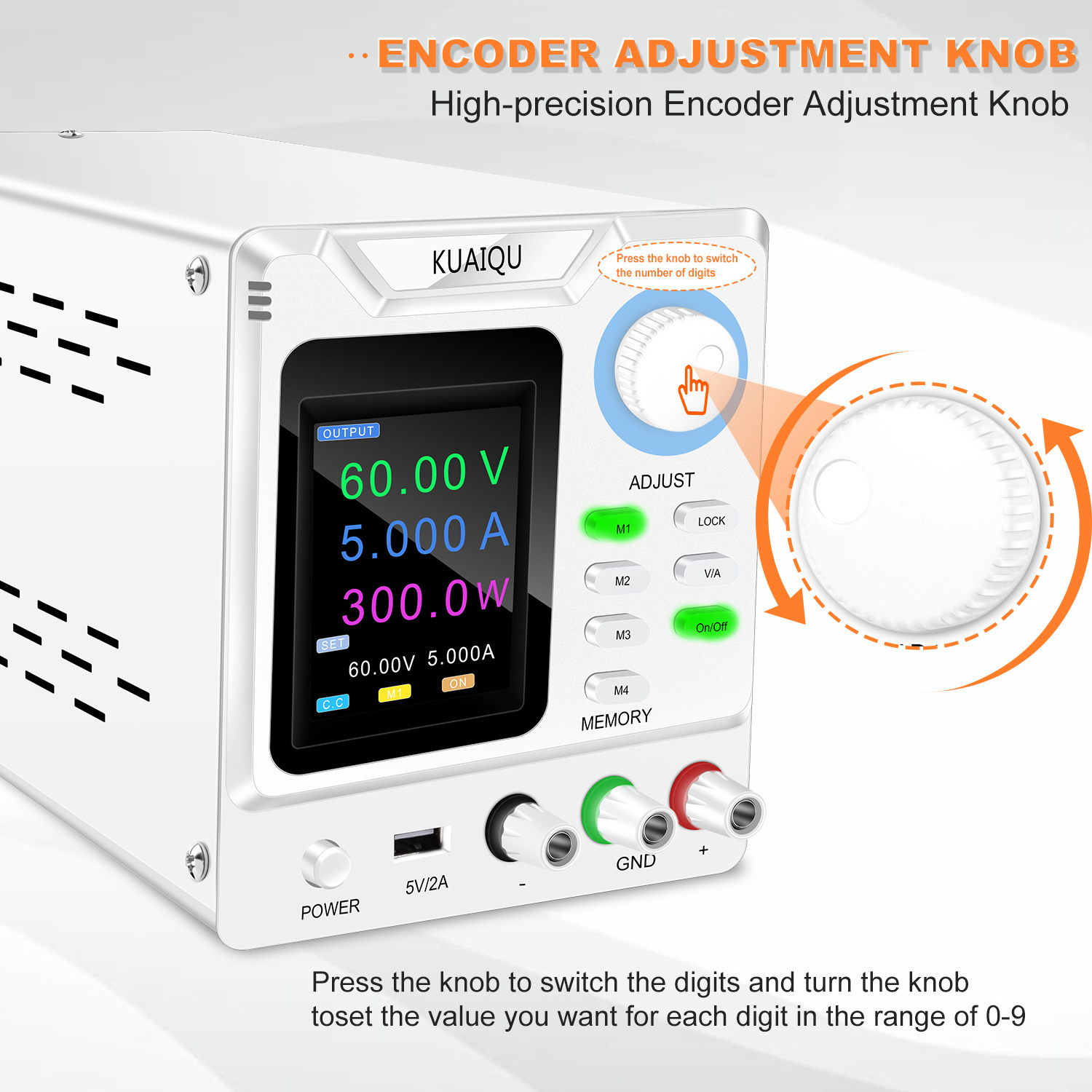 DC Power Supply 60V 5A Adjustable Switching Regulated DC Bench with 4-Digits LED Power Display 5V/2A USB Output programmable
