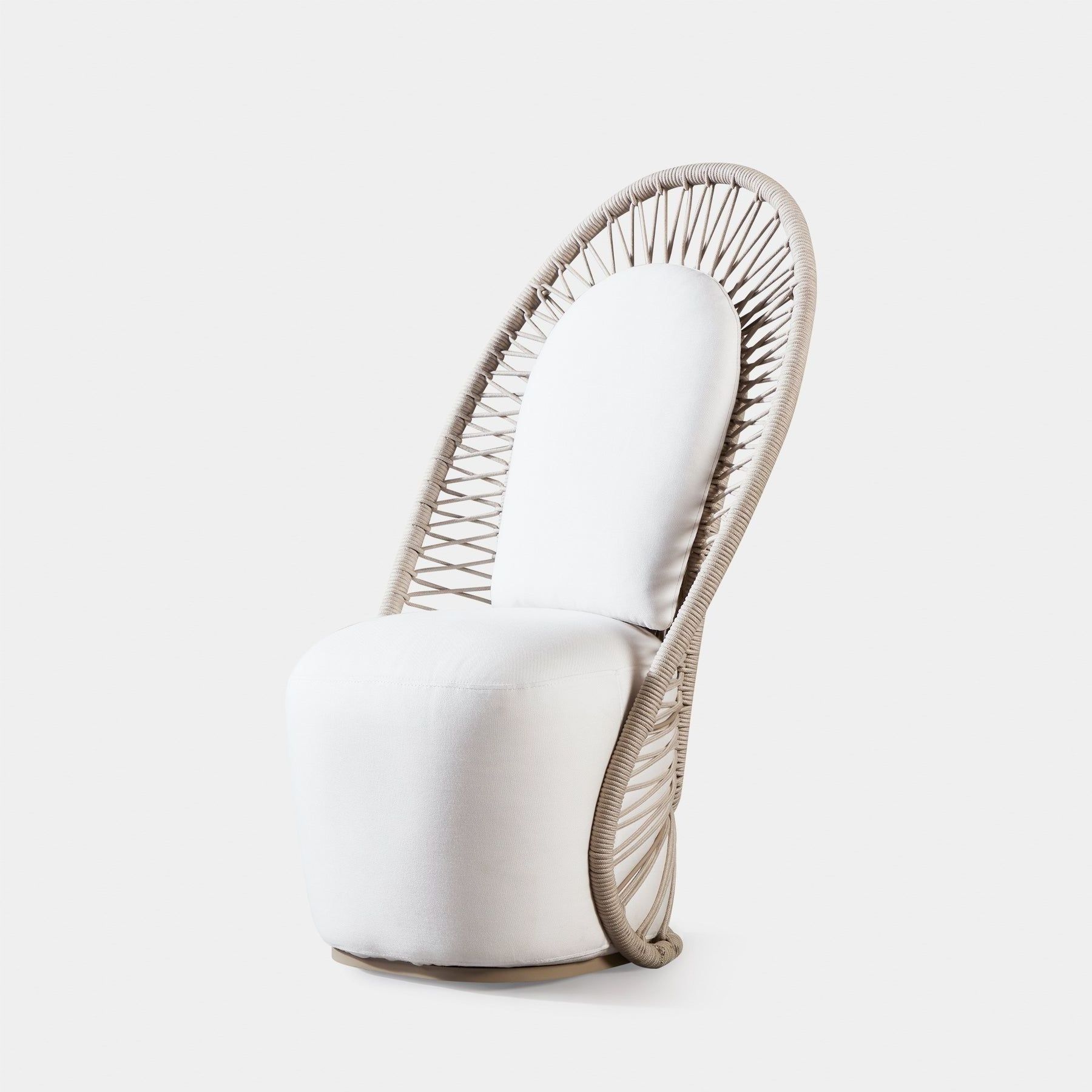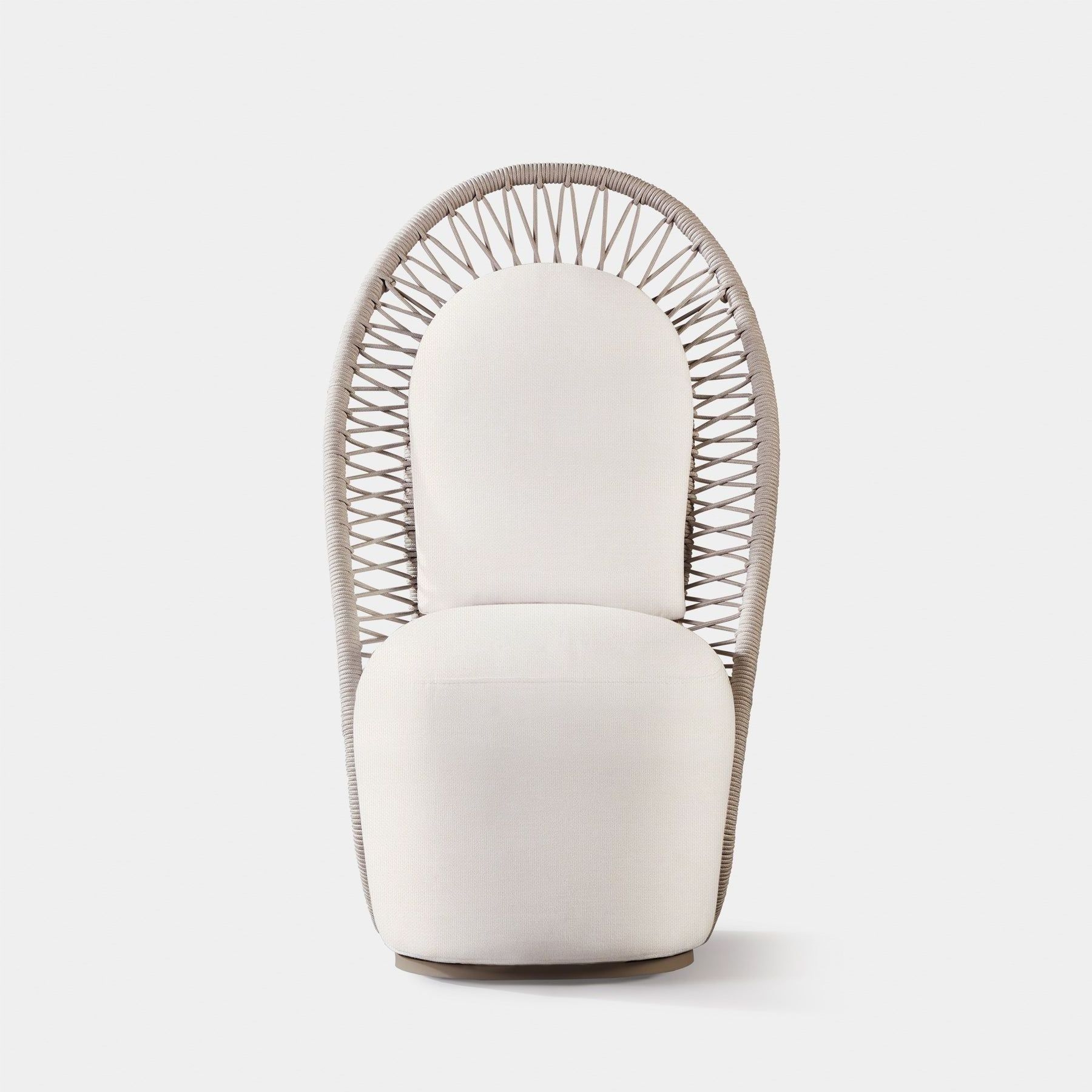 Designed by Marcel Wanders Studio. Featuring a signature radial rope pattern that creates a sophisticated rhythm, our Maui collection is nomadic luxury. Inspired by the rounded forms of a wide-brimmed straw hat, the Maui Lounge Chair is the grounding element to your space — enjoy a generous seat cushion with a multi-dimensional rounded back hand woven from all-weather taupe rope, all on a sliver of an aluminum plinth base. A casual mix of round and rectangular back pillows completes the aesthetic. Refined and yet Bohemian, this conversation piece amplifies any space.