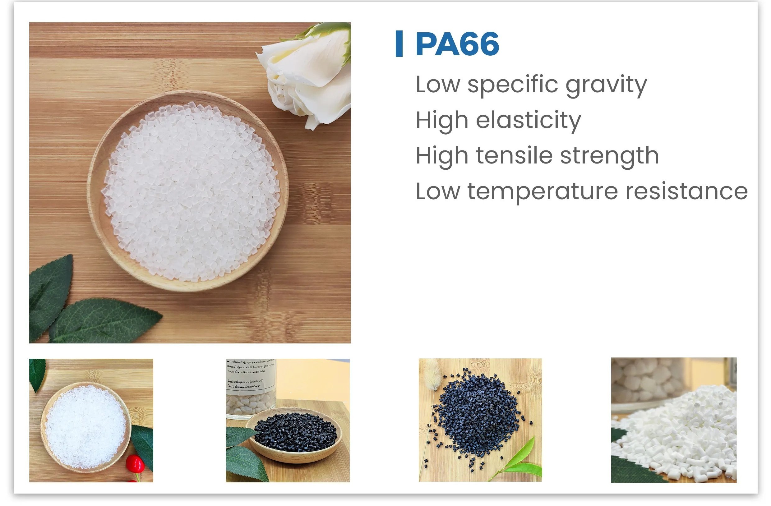 PA66 plastic material is translucent or opaque milky white crystalline polymer, with plasticity. Density 1.15g/cm3. Melting point 252℃. Embrittlement temperature -30℃. Thermal decomposition temperature is greater than 350℃. Continuous heat resistance 80-120℃, equilibrium water absorption rate 2.5%. Resistant to acids, alkalis, most inorganic salt solutions, halogenated alkanes, hydrocarbons, esters, ketones and other corrosion, but soluble in phenol, formic acid and other polar solvents. It has excellent abrasion resistance, self-lubricating property and high mechanical strength. However, the water absorption is large, and thus the dimensional stability is poor.PA66 is the highest mechanical strength of PA series, the most widely used species, because of its high crystallinity, so its rigidity, heat resistance are higher.