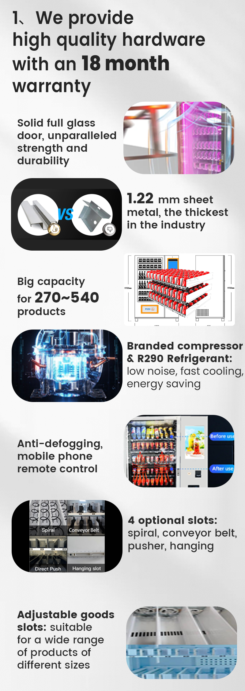 We offer five different types of slots for you including spiral coils/direct push/conveyor belt/hanging slots/locker. You can choose the one that fits you the best according to the dimensions of your products.