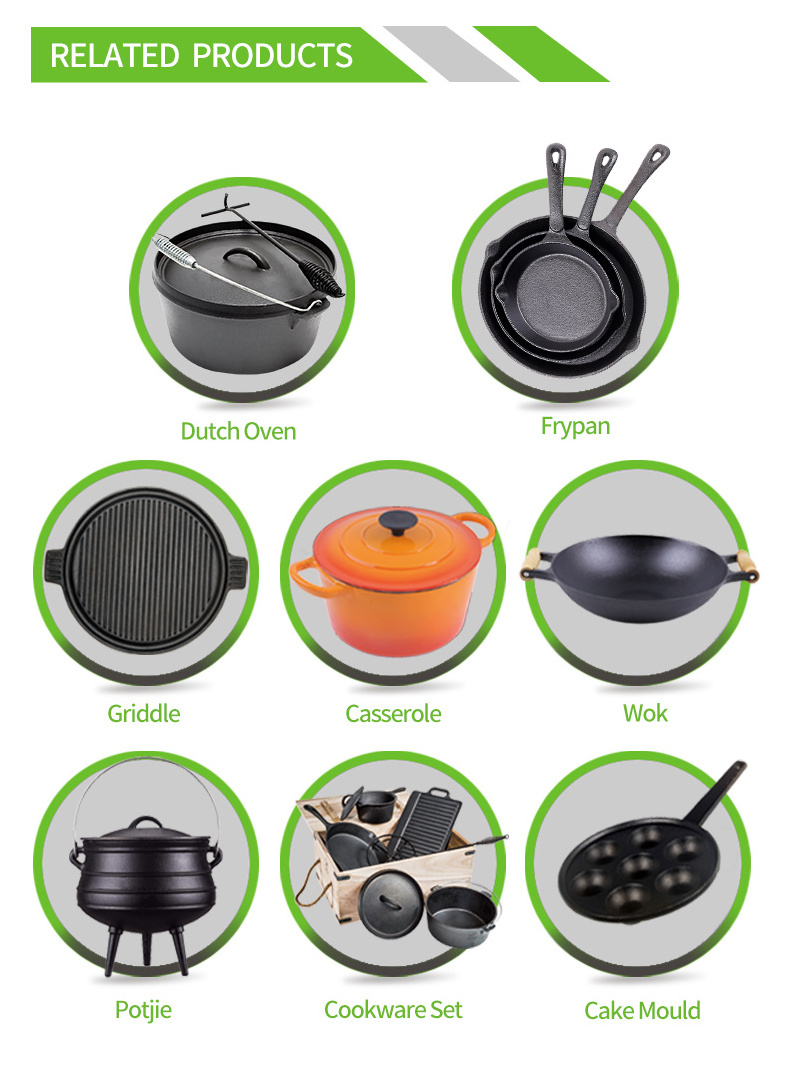 just for your health and delicious food ,our cookware never Make you regret , pre-seasoned coating make a healthy diet for you, for the high quality iron raw material,can supply human body the necessary iron element, when you cook,the pot can keep 230 °C constant temperature,and keep the food original taste and non-stick, good things just you , come and lead your healthy life .