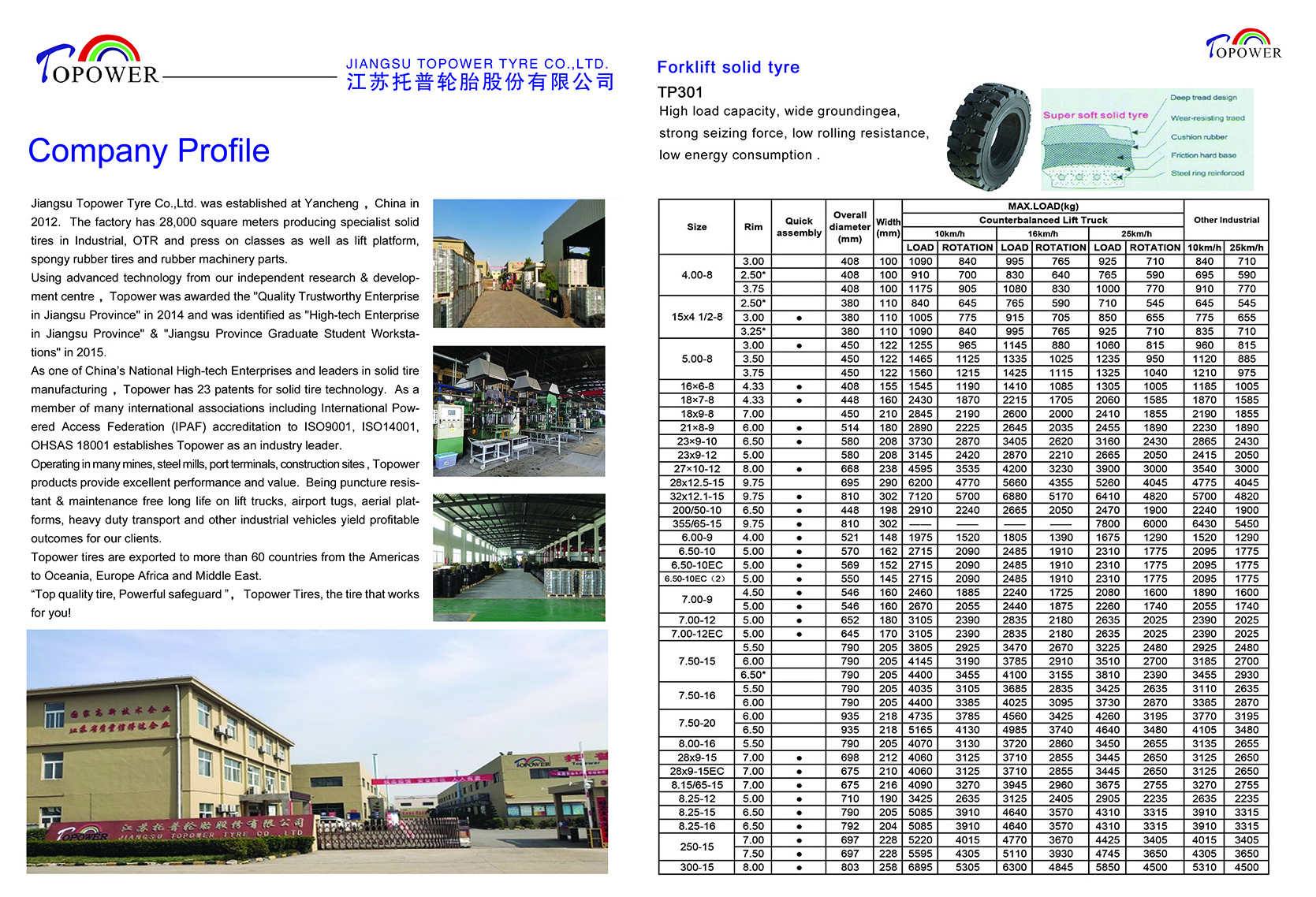 Jiangsu Topower Tyre has provided solid tires to the global market place since 2012. With our own manufacturing plant producing Industrial, O T R, press-on solid tires ,aerial work platform tires , rubber parts as well as run-flat tire system,the global reach of Topower includes many OEM machinery producers.