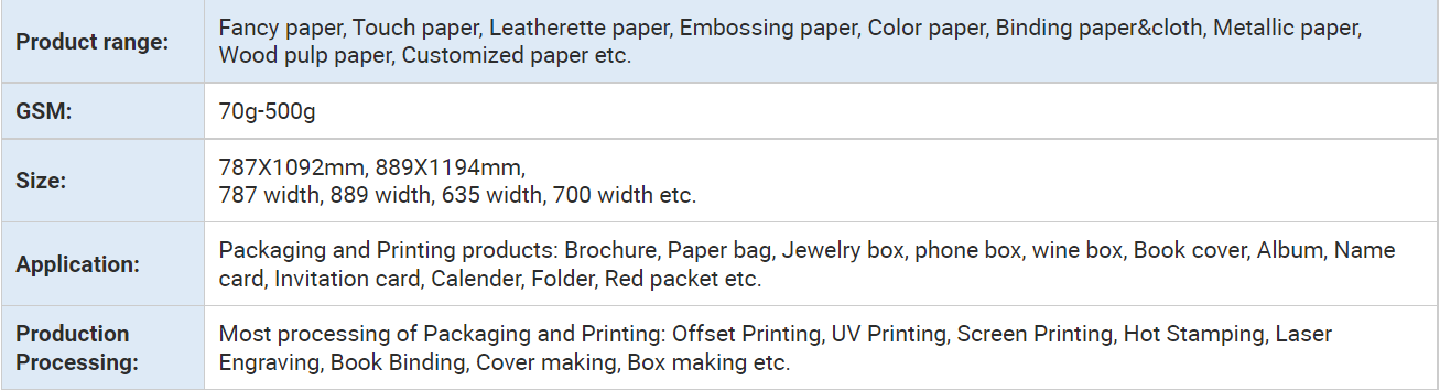 Fancy paper, Touch paper, Leatherette paper, Embossing paper, Color paper, Binding paper&cloth, Metallic paper, Wood pulp paper,Customized paper etc.