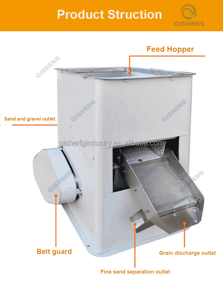 QISHENG rice stone remover is a professional grain cleaning equipment, which is widely used for the separation of stones, sand, dust,straw and other impurities in rice, wheat, millet,sorghum and other grains. The machine is small in size, high in efficiency and low in energy consumption, and can be used in small family farms and grain processing plants.