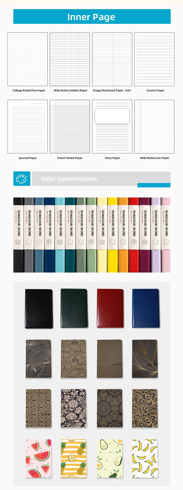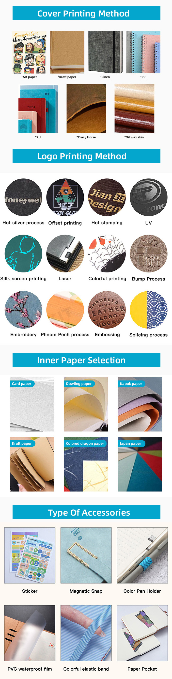 The color,size,logo,design,inner sheets all could be customized