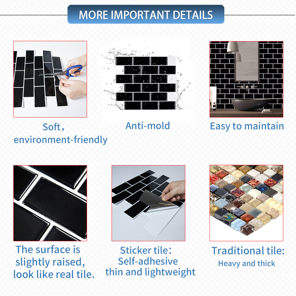 Easy to install, 3D effects, Waterproof, Oil-proof, Self-adhesive and Eco-friendly