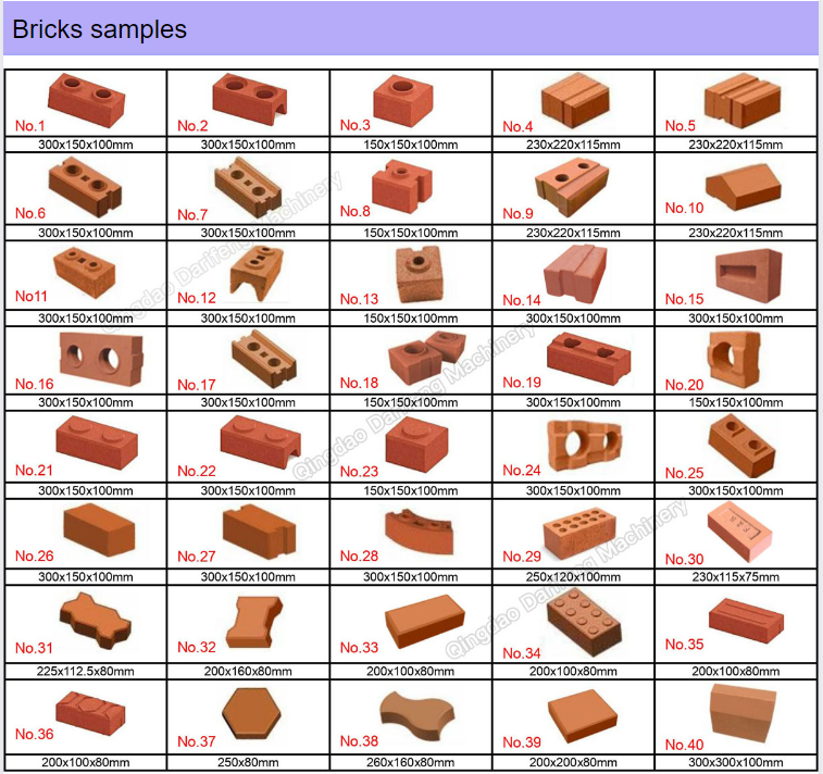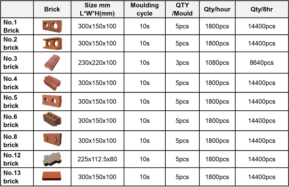 DF5-10 can make all of above bricks by changing the moulds, we can also customize the moulds according to your requirements.