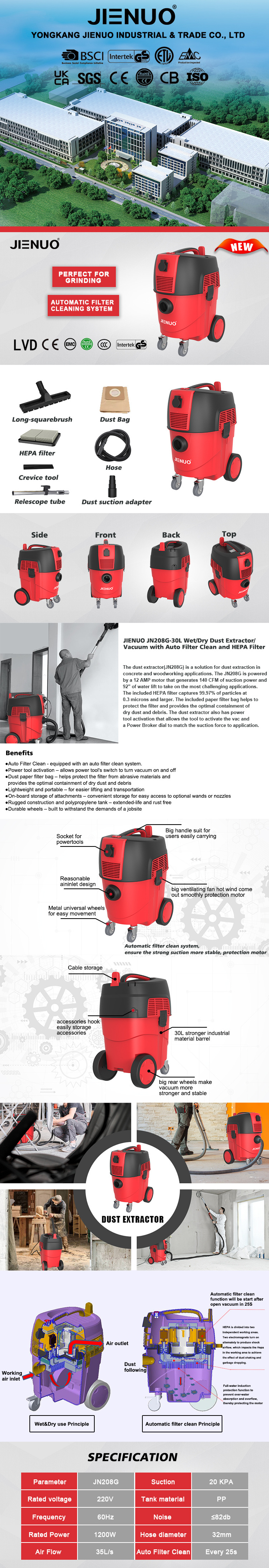 ① Extension Tube ②1.5m Soft Hose ③HEPA ④Long-square brush⑤Dust Paper Bag⑥Crevice Tool