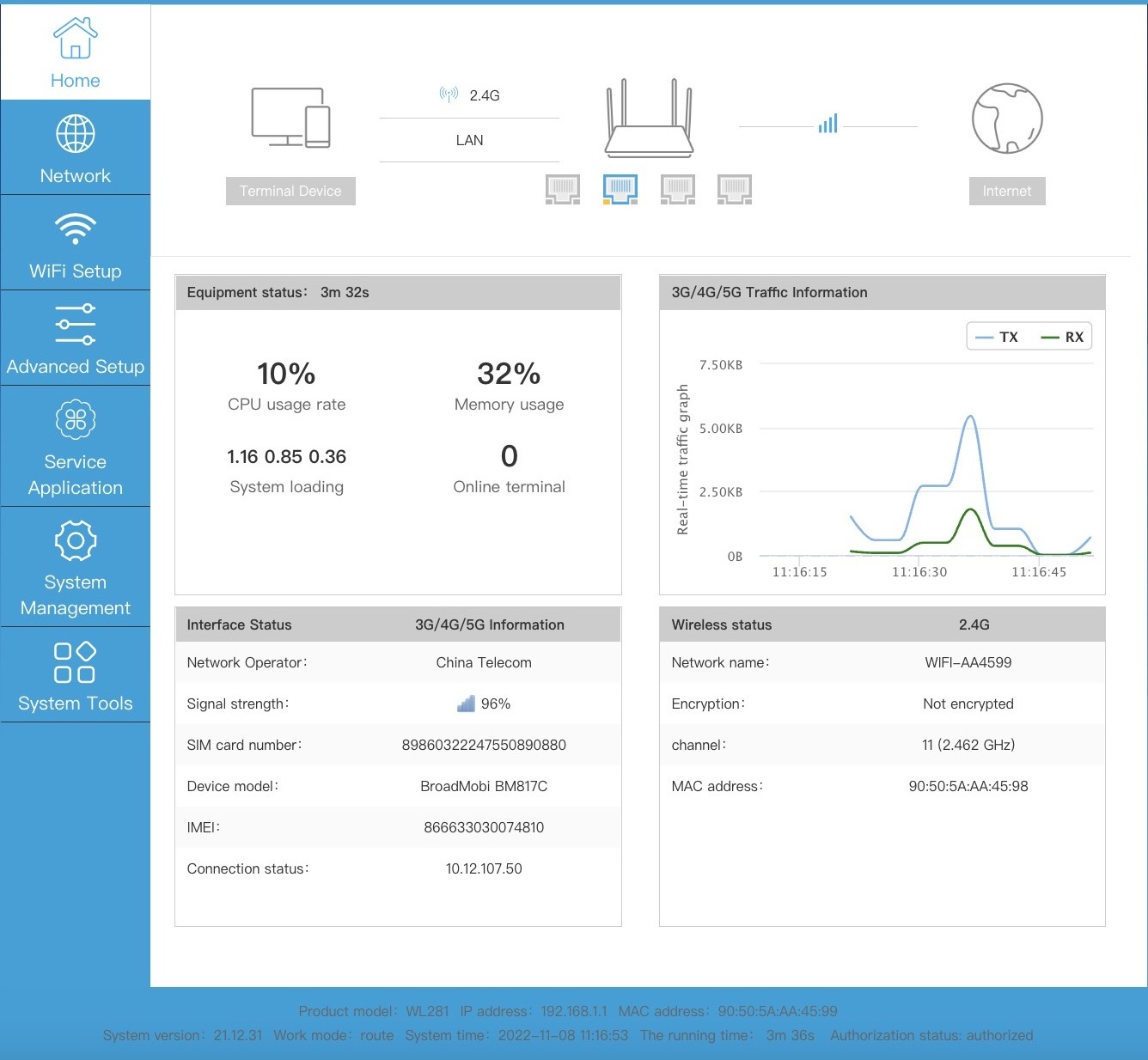 WE286 is a 4G routing product targeted at home or vehicle. It accesses the Internet through 4G mobile communication dial-up or 100Mbps WAN port dial-up, and then shares the Internet network via wireless WiFi4 and 1000Mbps wired LAN.