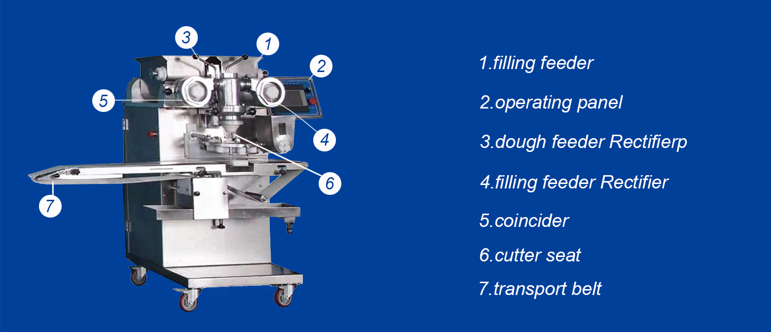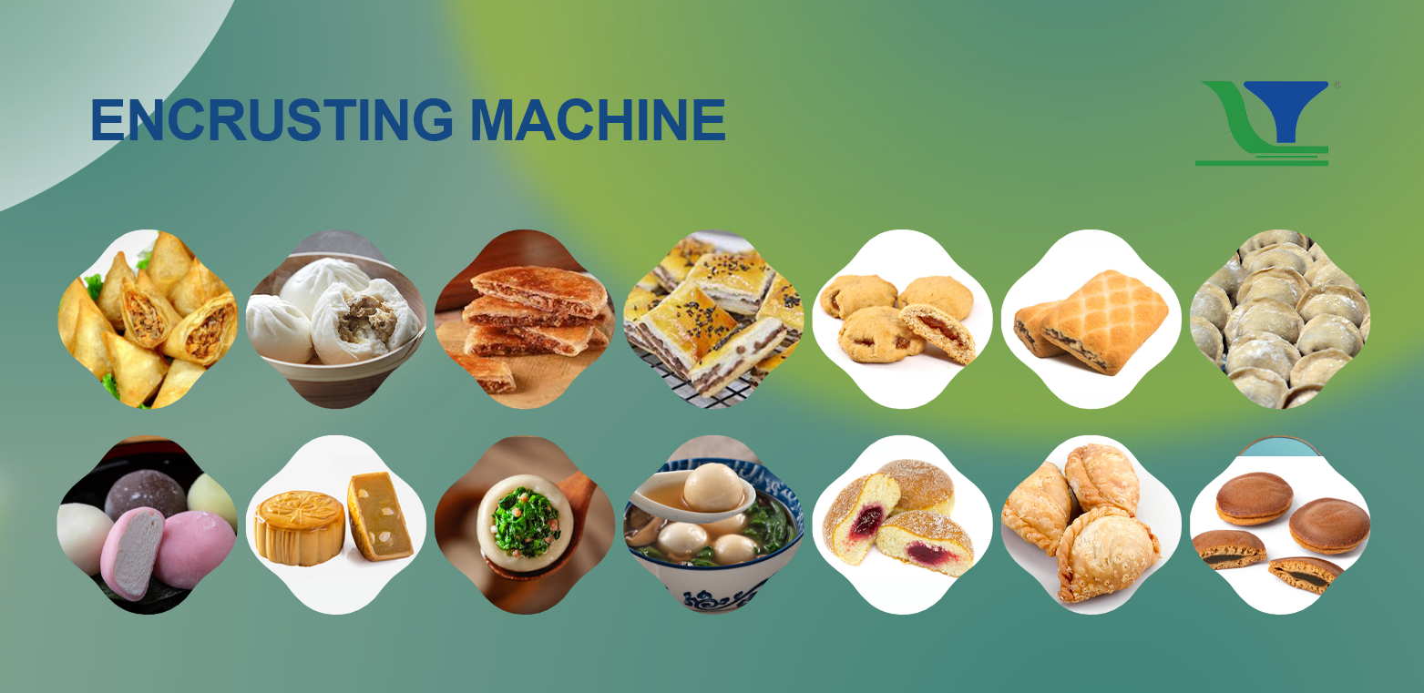 To achieve an ideal effect, the Encrusting Machine can Molding various products’ shape according to users’ special requirements such as factory’s layout and biscuit’s style, shape. Finsihed food samples such as Soft filling cookie,Marguerite cookie,Filled twist cookie, Apple pie,filled donuts,filled biscuit ,moon cake,peach bun,Tang-yuan,mochi. Chinese meat bun,steamed bun,etc.