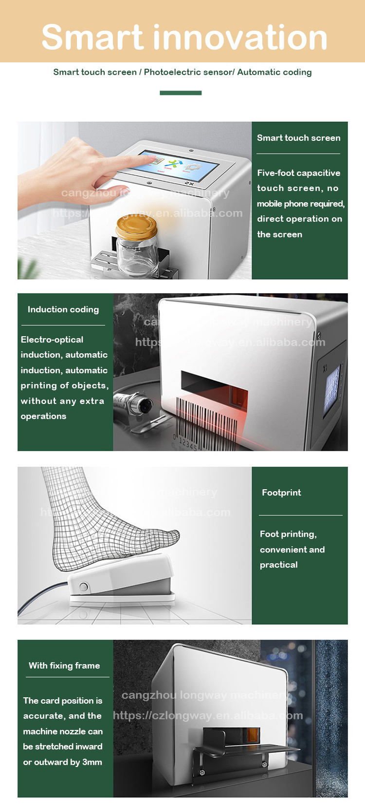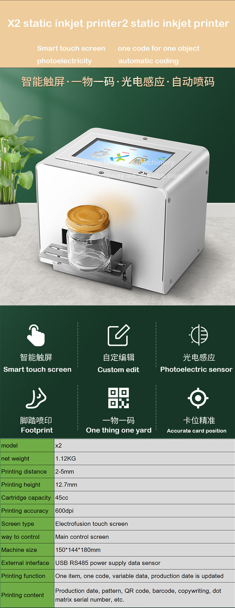 designed the ink cup to prevent the ink from drying,the final word printed will be clear,and improve the quality of printing,easy using.can print codes on aluminum cans,bottle bottom concave, cosmetic bottles,stoving varnish producrs, ballpoint pen refill ,thin paper cardboard,paper sheet,leather,plastic film,aluminum foil,especially suitable for coding on paper box of shoes,clothing.It is great help in daily using, medicine, chemical industry and food.It is low cost,low electricity consumption,less manual, and high speed,save time.