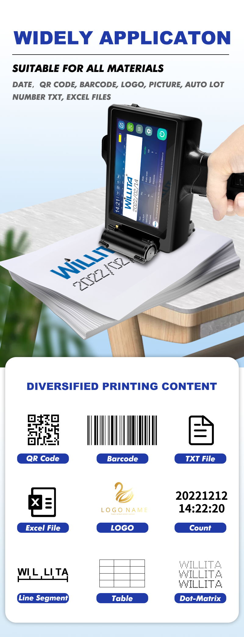 TEXT, TIME,BATCH NUMBER,SERIALNUMBER,PICTURE,QR cODE,BARCODE
