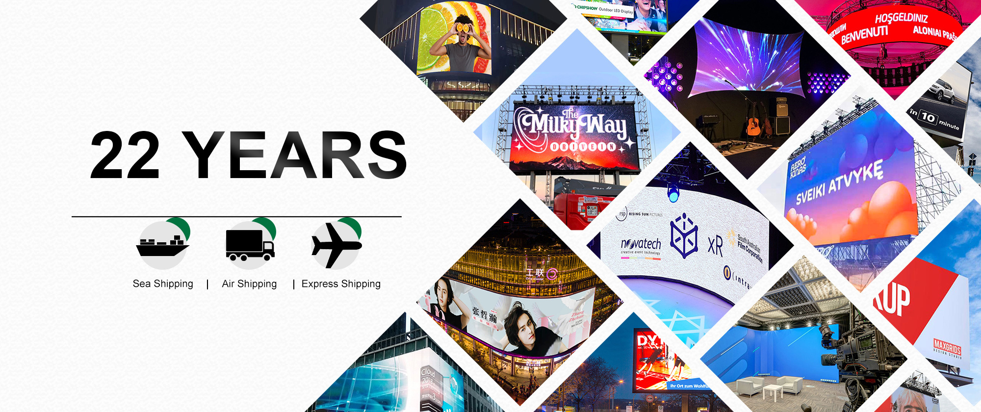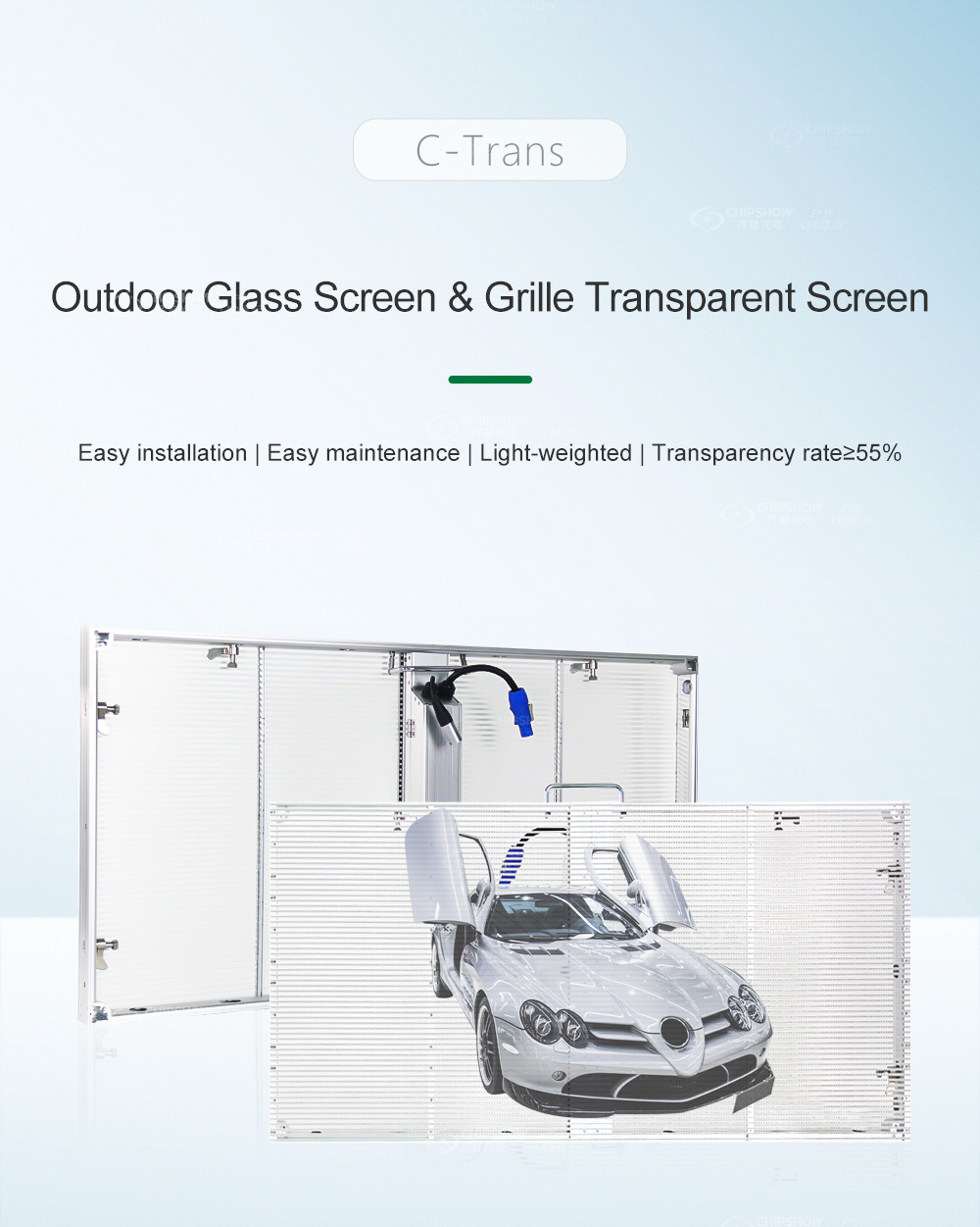 1. Lightweight and transparent: weight is only 16kg/㎡, single box weighs 7Kg, box thickness is 47.5mm (including power box 97mm);