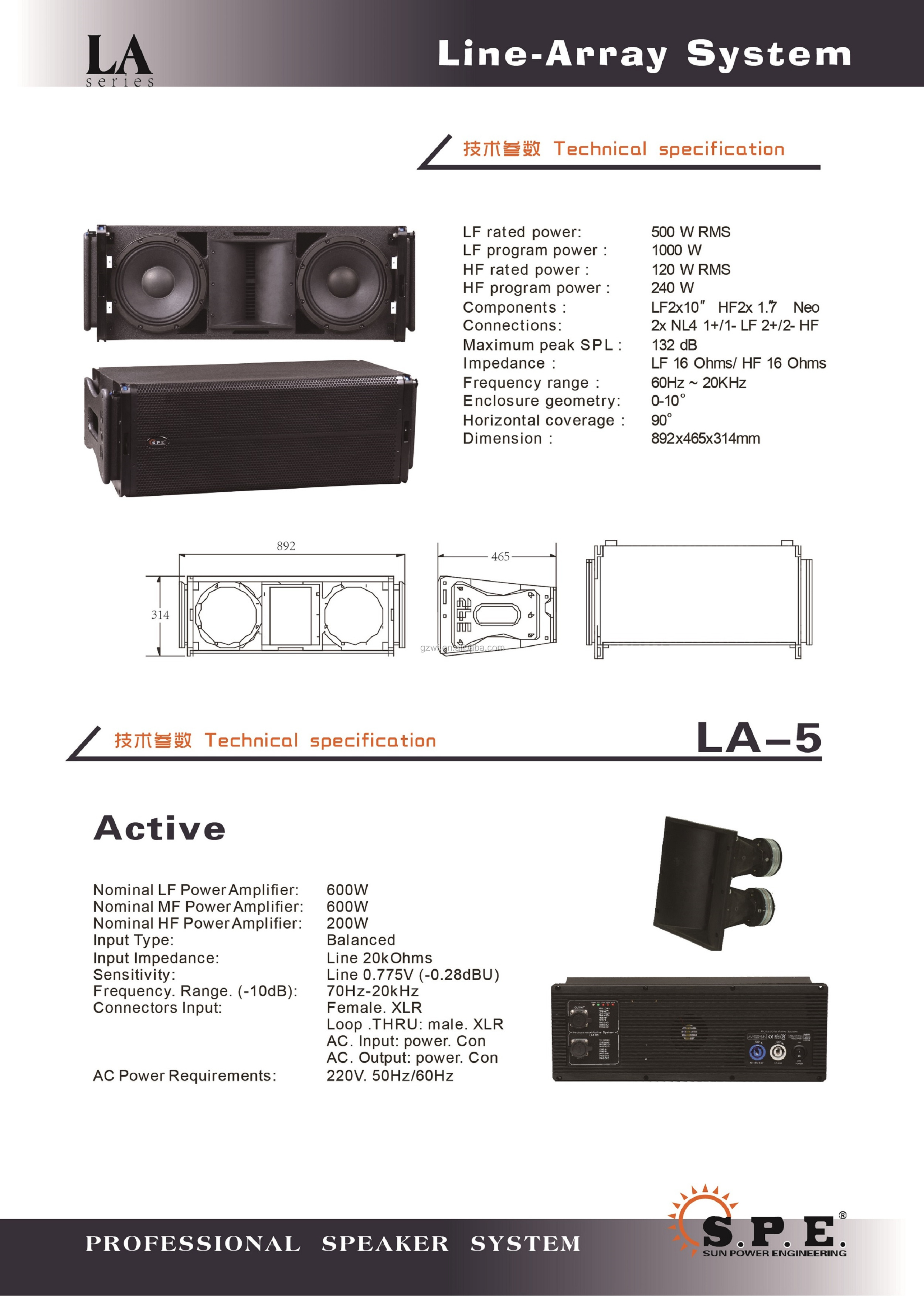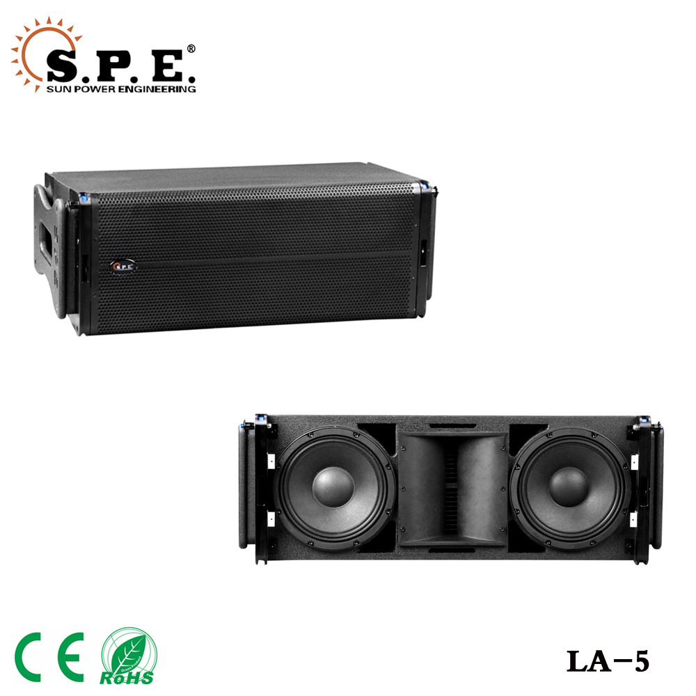 The LA-5 uses a 3-way professional performance sound. The bass uses a 10″ unit,Component with LF 2*10"and the high frequency uses two 1.7″ NEO units. The cavity design, the parameters of the fine calculation unit, and the principle of physical resonance make each unit work in different frequency band cavities. LA-5 has large power, sensitivity, convenient link and flexible use. LA-5 adopts active Power amplifier driven mode design, the power amplifier uses 3 channels to drive different units, built-in amplifier protection box and fan cooling system effectively improve the reliability of the power amplifier. LA-5 is equipped with high-performance class D power amplifier, with high efficiency and loss. Small, low temperature, etc. The LA-5 is flexible and convenient to upgrade passive systems with LA-5B/2×15″ active low frequency. External DSP digital processor mode for customer choice. LA-5 is suitable for medium and large-scale mobile performances, concerts, auditoriums, concert halls, and fixed installations.