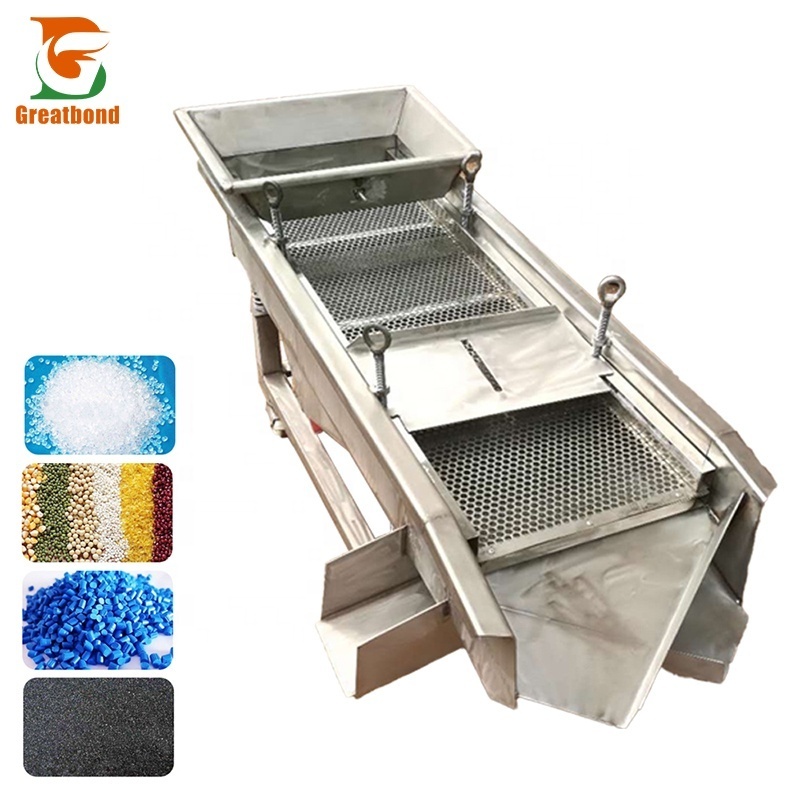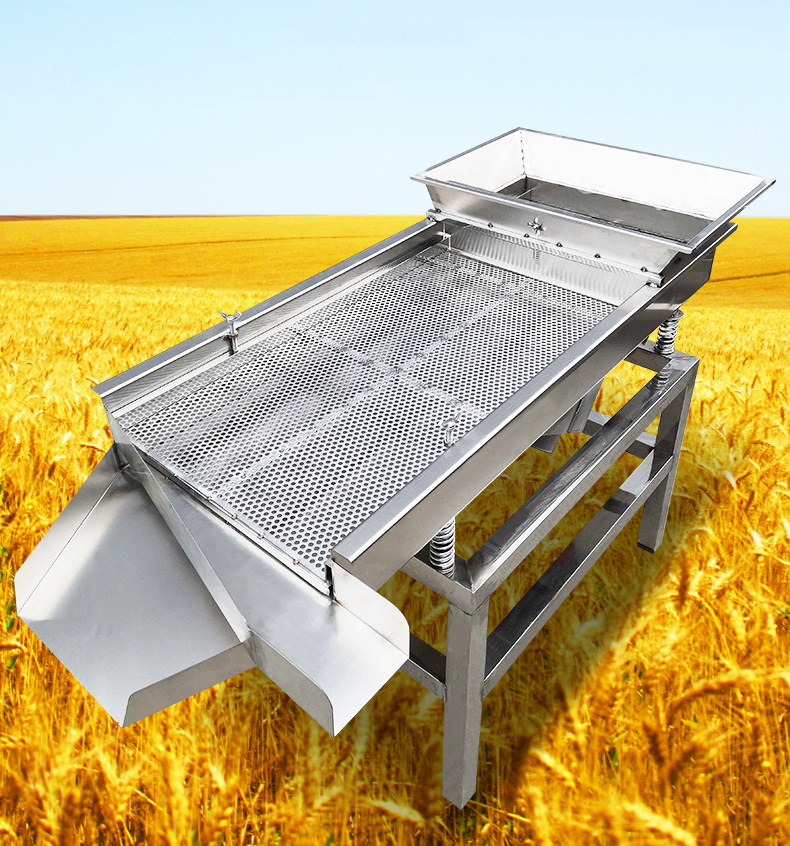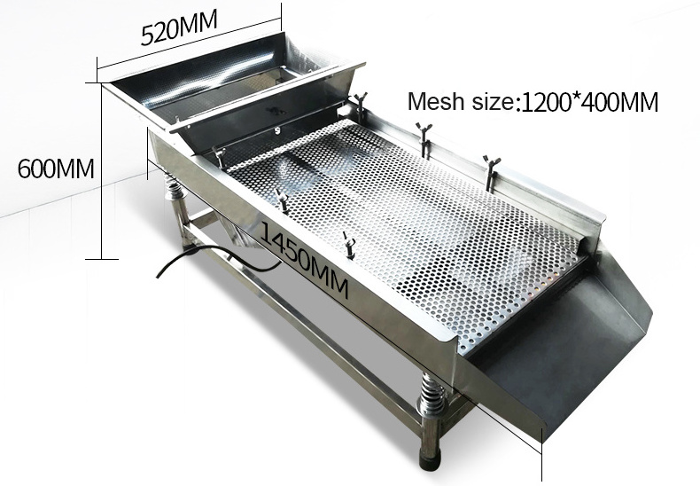 All stainless steel linear screen (linear vibrating screen) uses the vibration motor as the vibration source to make the material thrown on the screen and move forward in a straight line at the same time. The material evenly enters into the feed port of the screening machine from the feeder, and produces several specifications of materials on the screen and under the screen through the multi-layer screen, which are discharged from their respective outlets. The utility model