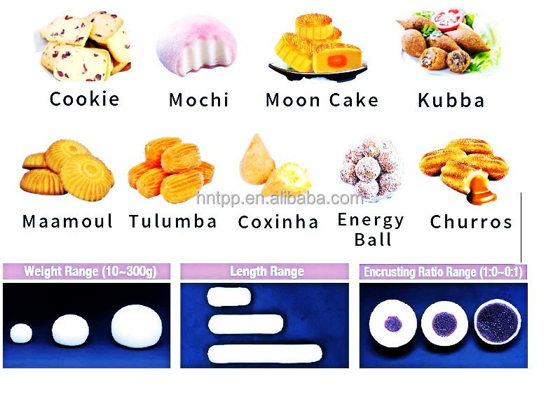 The model is light and versatile. It can make avariety of spherical, rod-shaped and other geometric shapes. The product weight, thickness ratio and production speed of the mooncake filling machine can be arbitrarily adjusted within the prescribed range. Various kinds of fillings that can be molded.