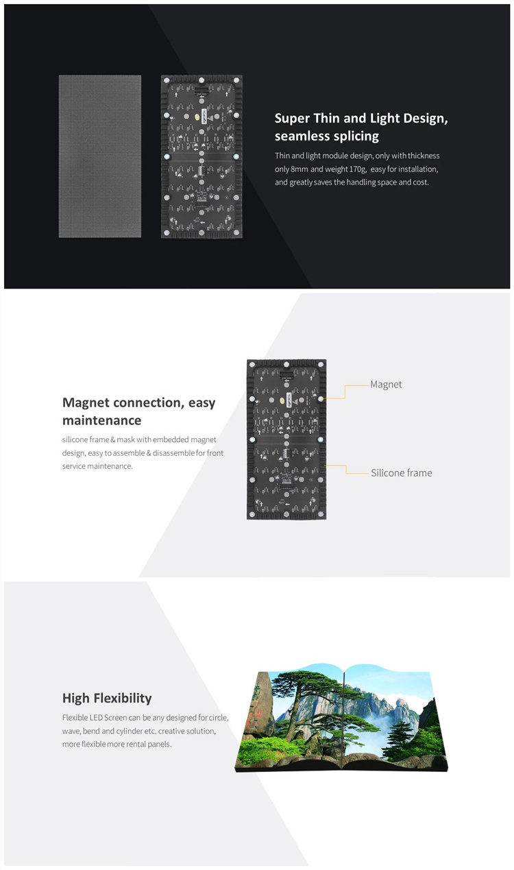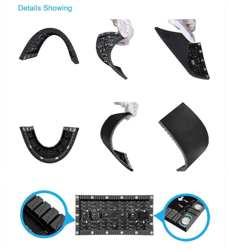 The p1.875 p2 p2.5 p3 p4 soft module flexible led display is suitable for curved or cylindrical display screens. It has a large bending range and can meet most shapes. It has realistic colors and is the best choice for special-shaped screens.