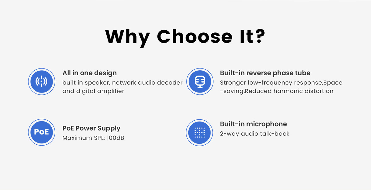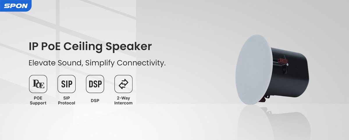 The speaker features wideband G.722 HD audio, PoE support, and loop detector. It has dynamic volume control and can play specific ringtones for emergency alerts. Compliant with 3rd party SIP endpoints and seamlessly integrates with VoIP systems and SPON® XC-9000 software.