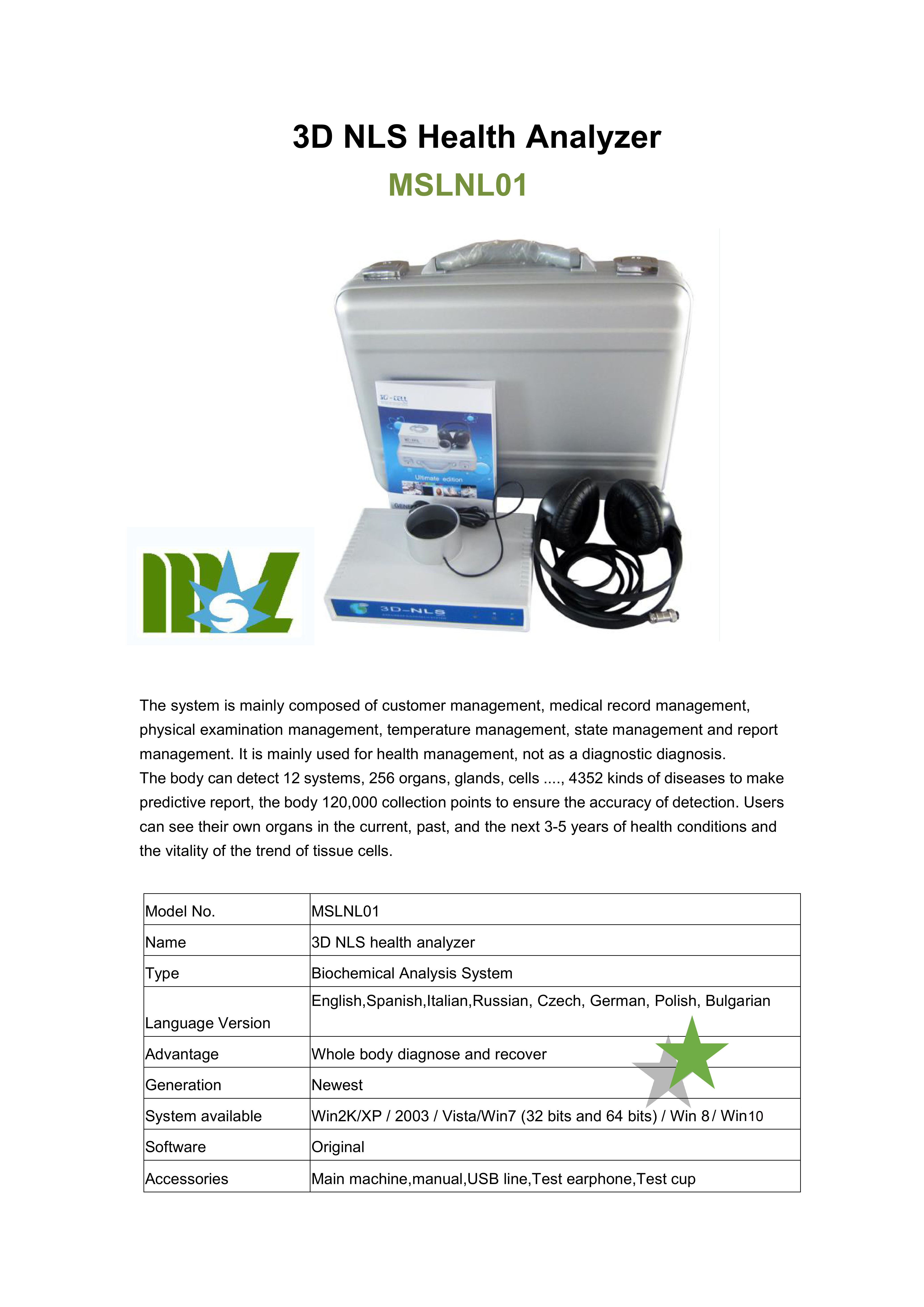 It is mainly used for health management, not as a diagnostic diagnosis.The body can detect 12 systems, 256 organs, glands, cells ...., 4352 kinds of diseases to make predictive report, the body 120,000 collection points to ensure the accuracy of detection. Users can see their own organs in the current, past, and the next 3-5 years