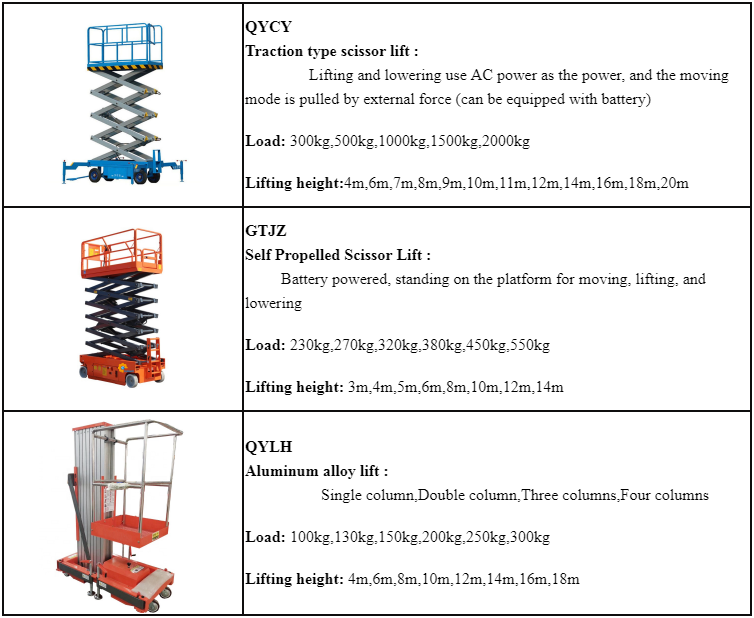 | Main products | Traction type scissor lift, Self Propelled Scissor Lift,Aluminum alloy lift |