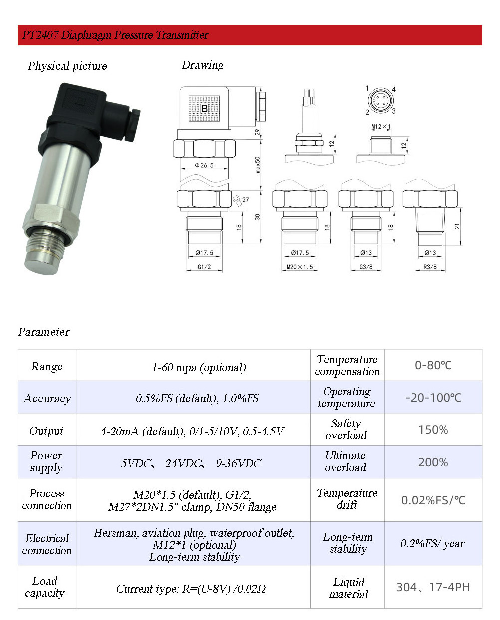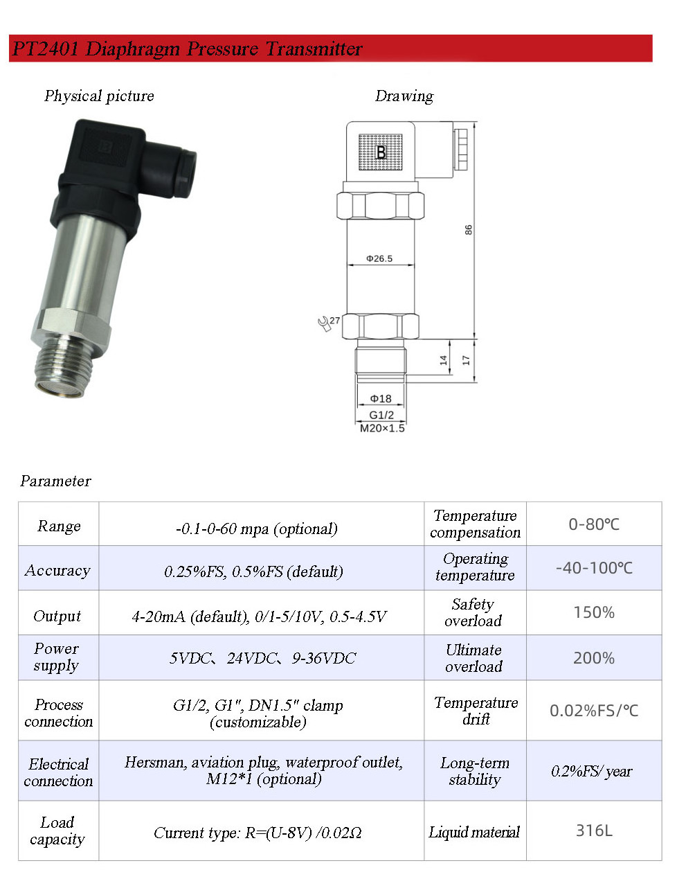 Pressure transmitter 4-20 ma sensor transducer diaphragm