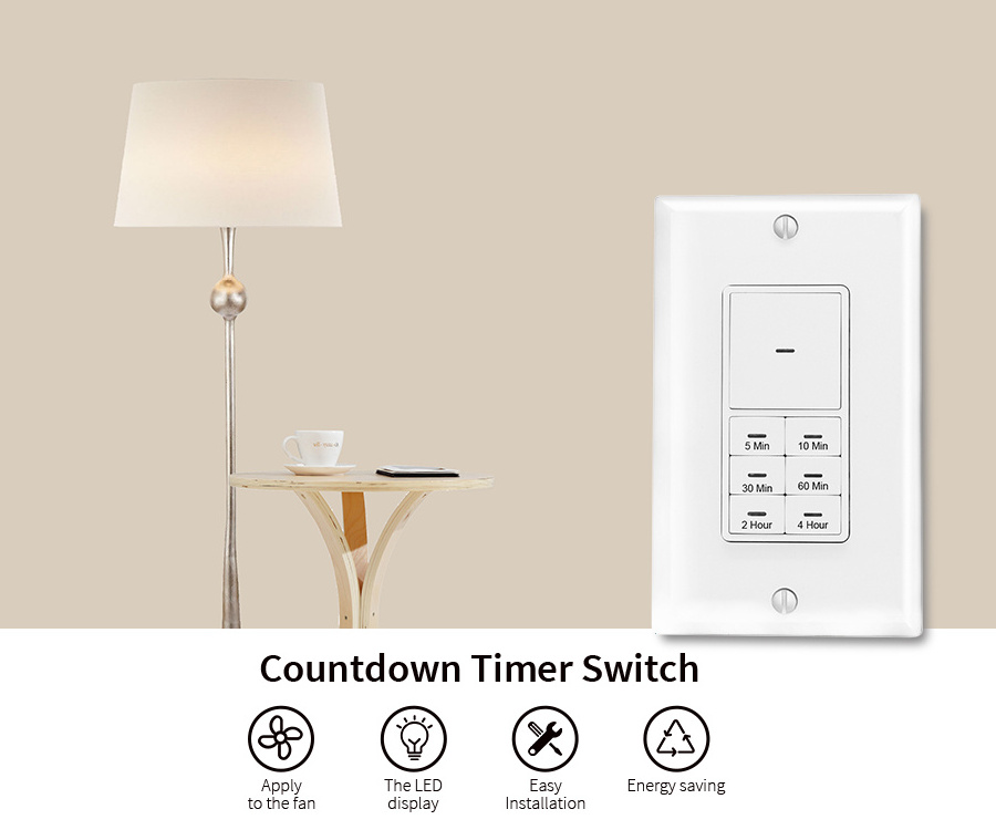 The time timer Push-Button Countdown is a timer switch with 6 preset time buttons and 1 Manual ON /OFF button. All Loads connect to this timer will automatically turn OFF when the selected time expires. The 6 selectable times are 5 Min, 10 Min, 30 Min, 60 Min, 2 Hours, and 4 Hours. Perfect for lights, ceiling fans, bathroom fans and heaters and other appliances. LED indicator for program & locating in the dark. Saves energy by ensuring lights are always turned off.