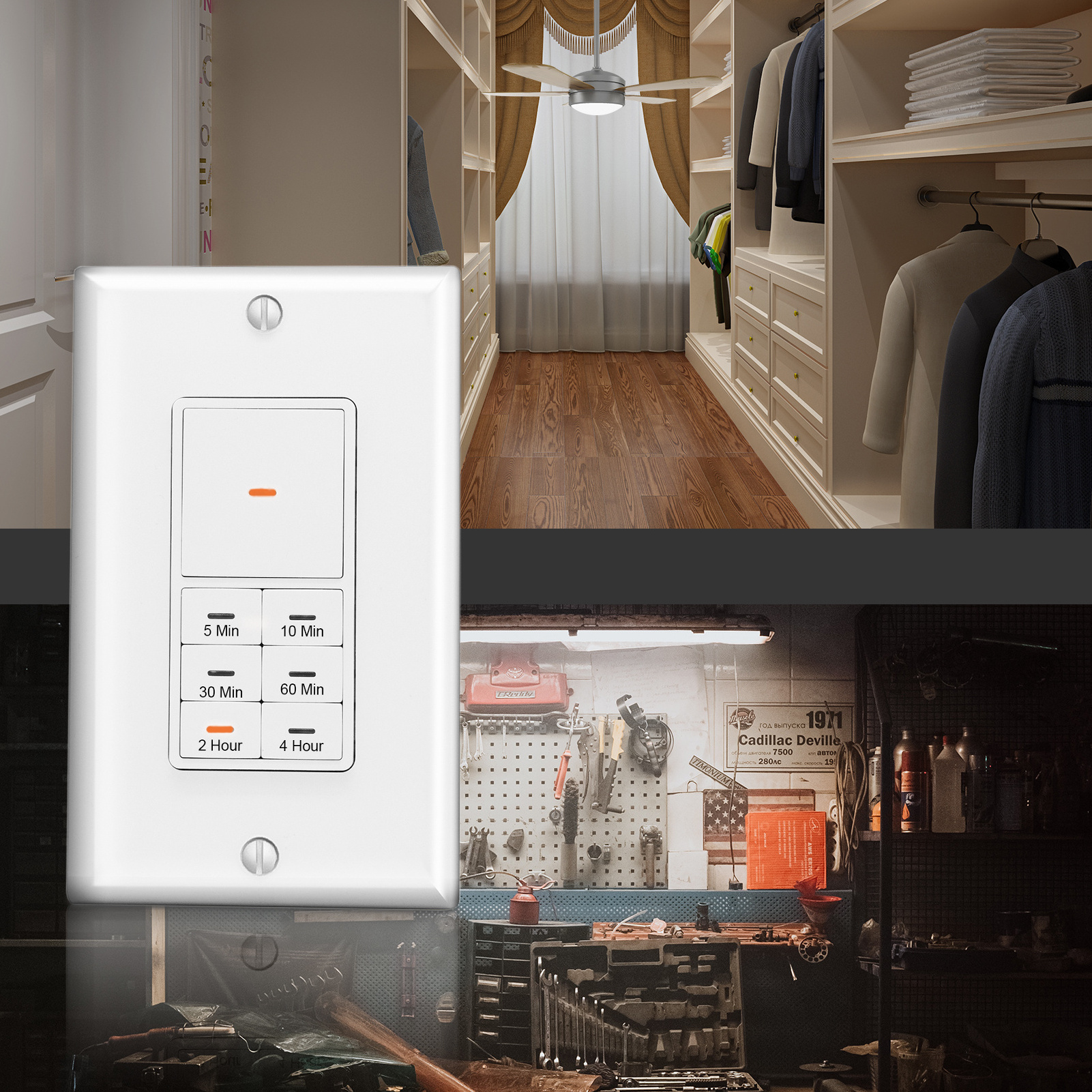 The timer’s versatility is not limited to lights. It can also be used for ceiling fans, exhaust fans, heaters and more. The timer is rated for 125VAC/60Hz and ETL certified.